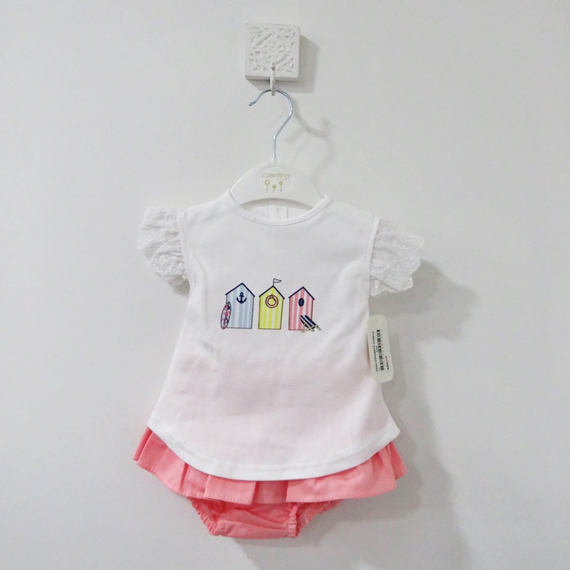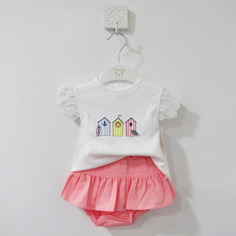 Conjunto com t-Shirt estampada e tapa fraldas com folho, para menina. Para menino, t-shirt estampada e calção azul.