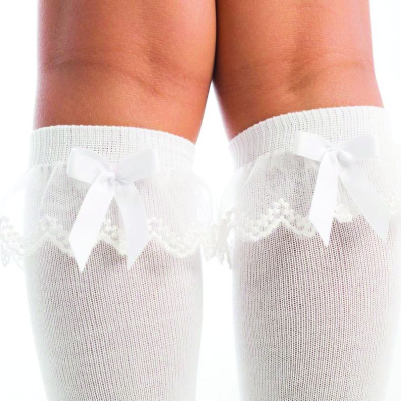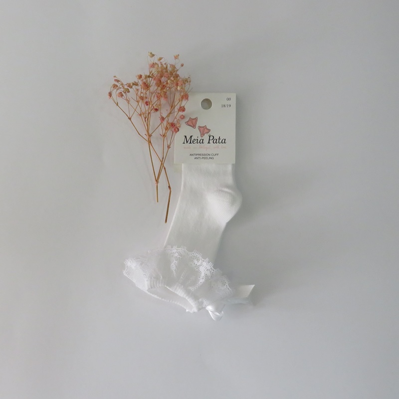 Meia lisa pelo joelho com tule e laço de cetim atrás da Meia Pata. Disponíveis em várias cores.