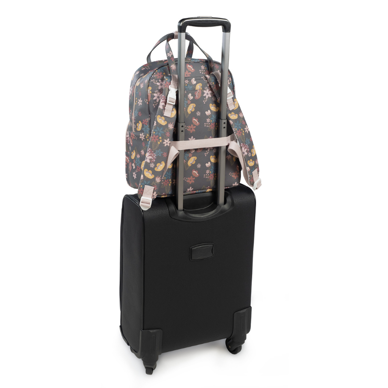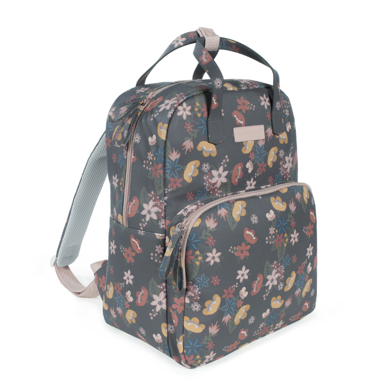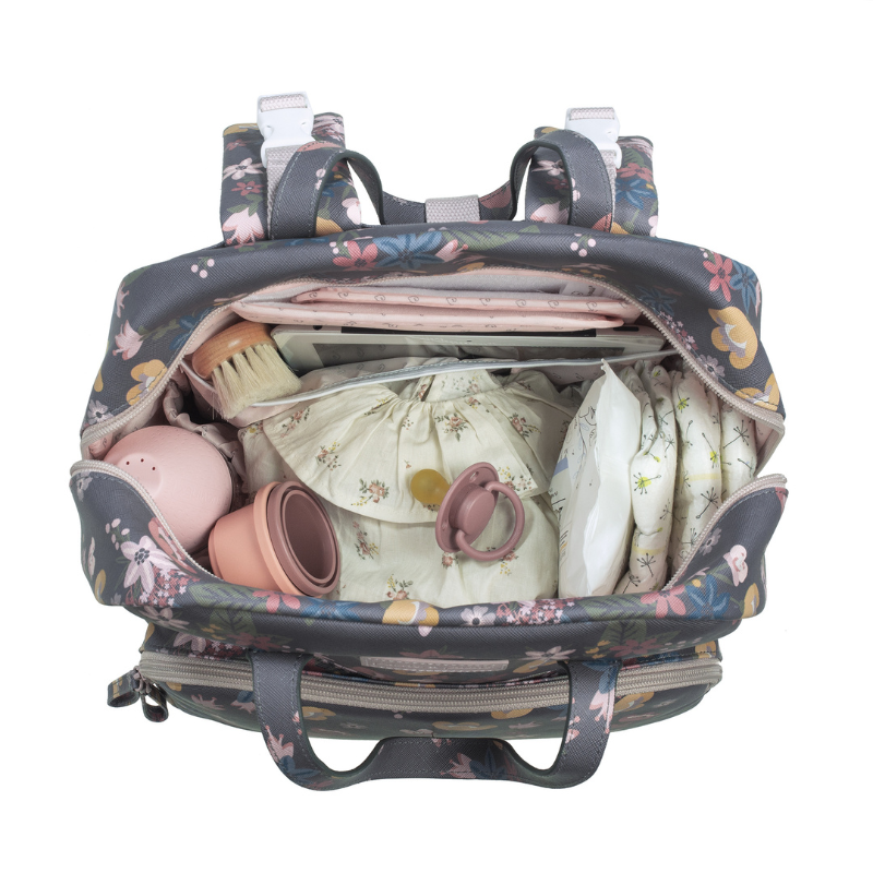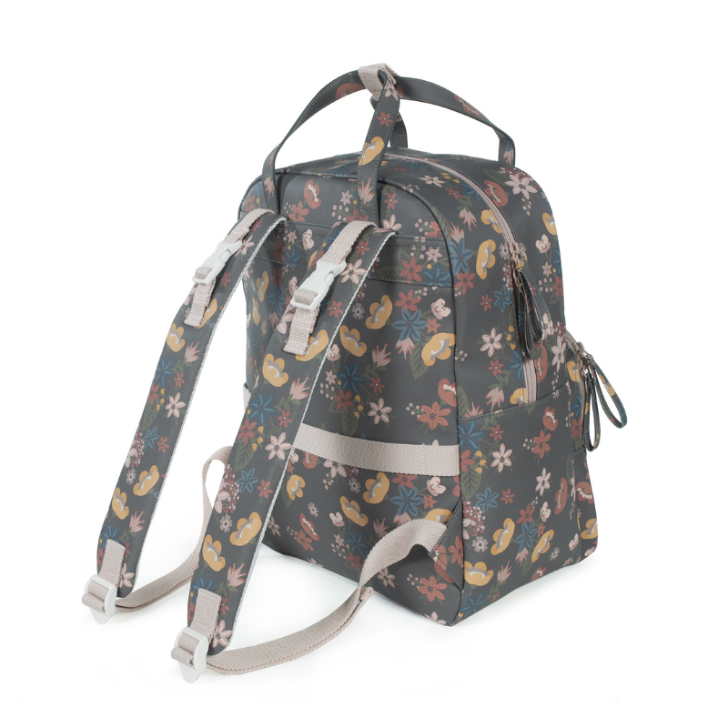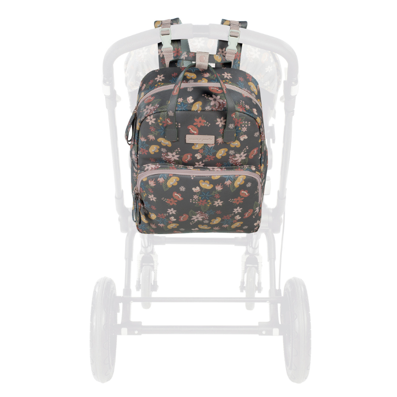 Mochila Garden em couro ecológico com flores. Grande capacidade para transportar tudo o que você e o seu bebé precisam. Bolsos interiores e exteriores para manter tudo à mão e organizado.