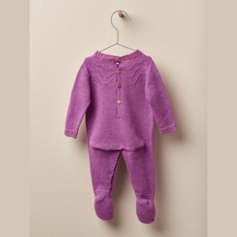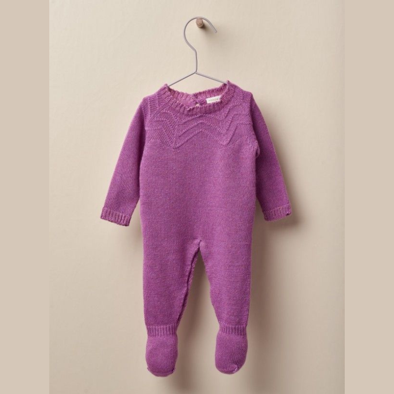 Babygrow de manga comprida tricotado numa mistura leve de lã merino, viscose, poliamida e caxemira suave, ideal para bebés meninos e meninas, até aos 6 meses. O babygrow MAGIC TALES aperta nas costas com botões de madeira e entre as pernas com molas. Produzido em Wholegarment, uma peça completa sem costuras, para maior conforto do seu bebé.