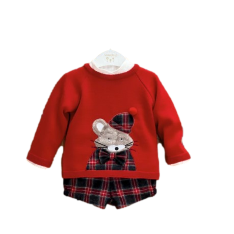 Conjunto de calção, camisa e camisola com bordado da Valentina.