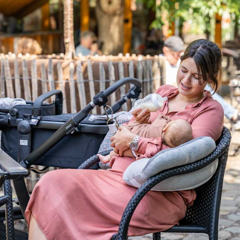 A almofada On the Go é a sua companheira como futura mãe, desde o início da gravidez até ao nascimento do seu bebé, para relaxar ou alimentar. A sua forma e enchimento foram concebidos para suportar a sua barriga. Isto alivia as suas costas e restabelece a posição natural da coluna vertebral quando está sentado ou deitado. Proteja a sua almofada enquanto viaja com o saco trendy, feito de material adequado para o exterior. Pode guardar este saco no bolso com fecho existente na almofada.
