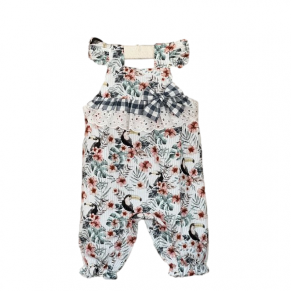 O macacão da coleção Leo da Valentina tem um mistura de padrões entre xadrez e animais exóticos.