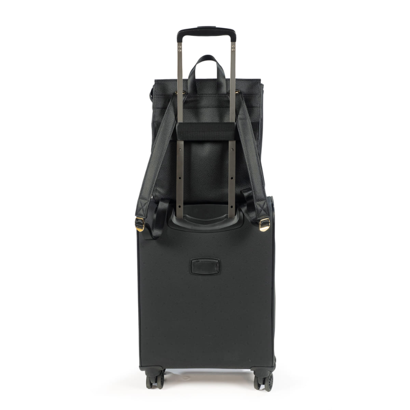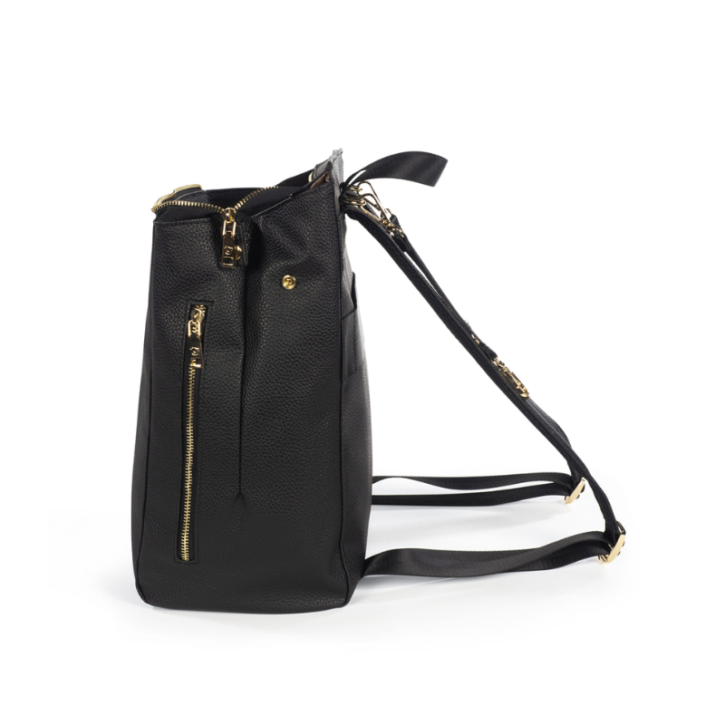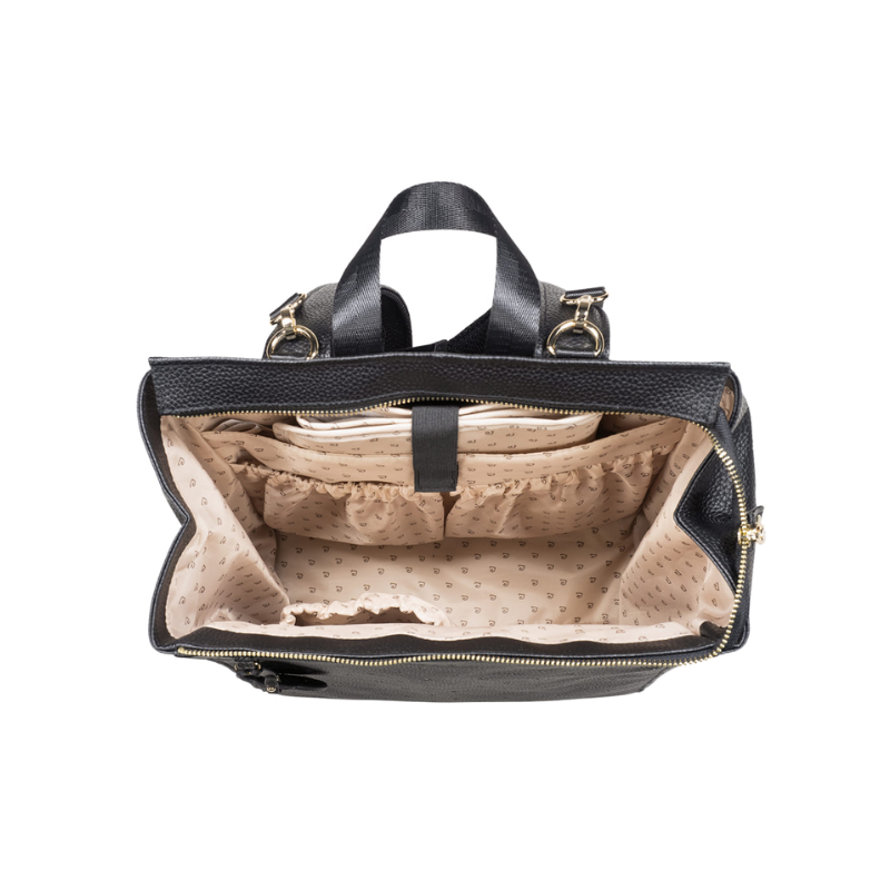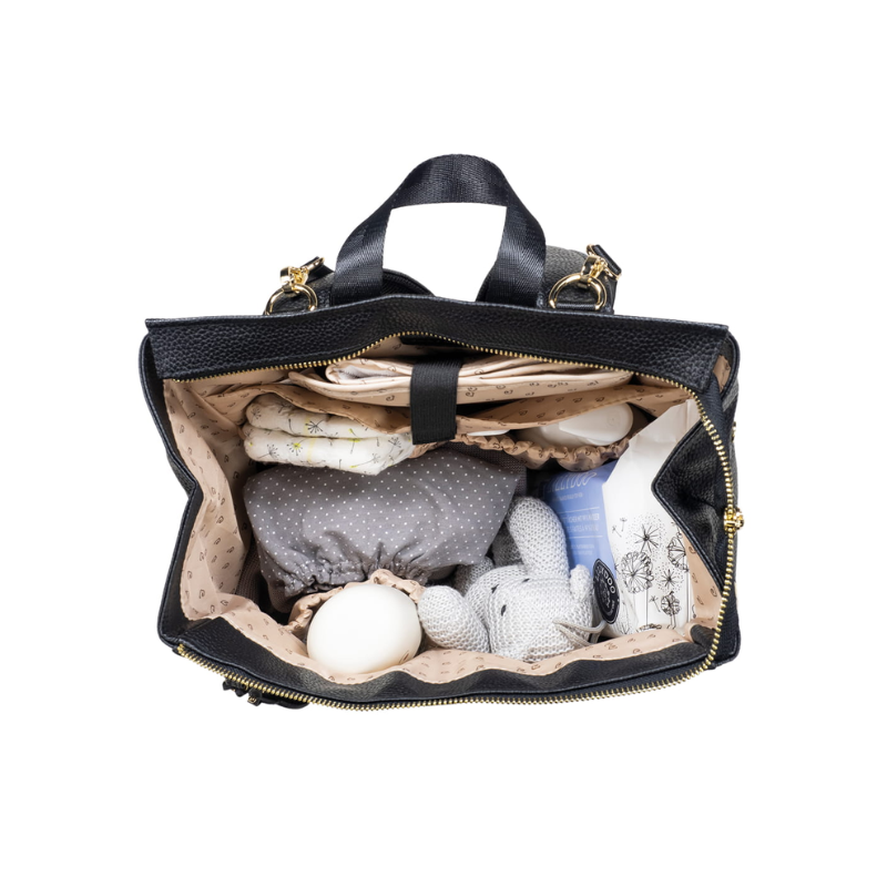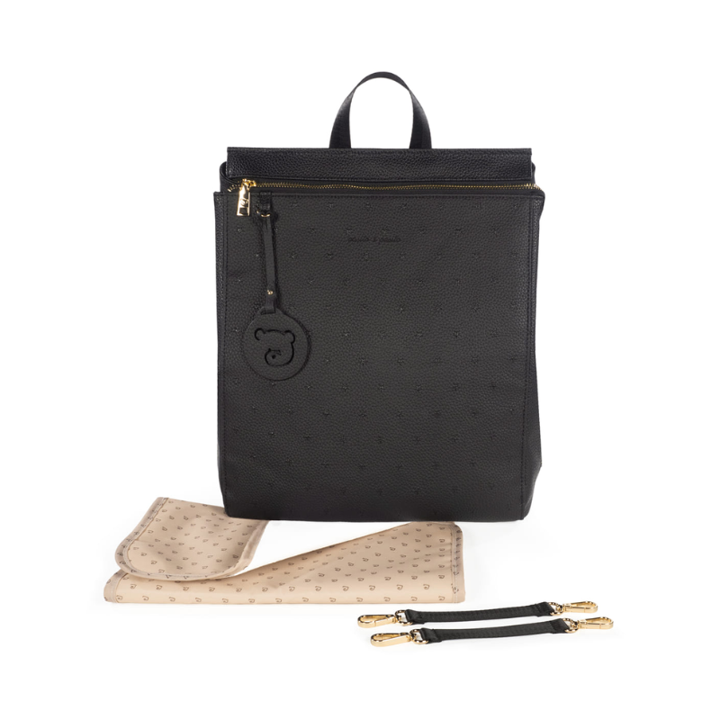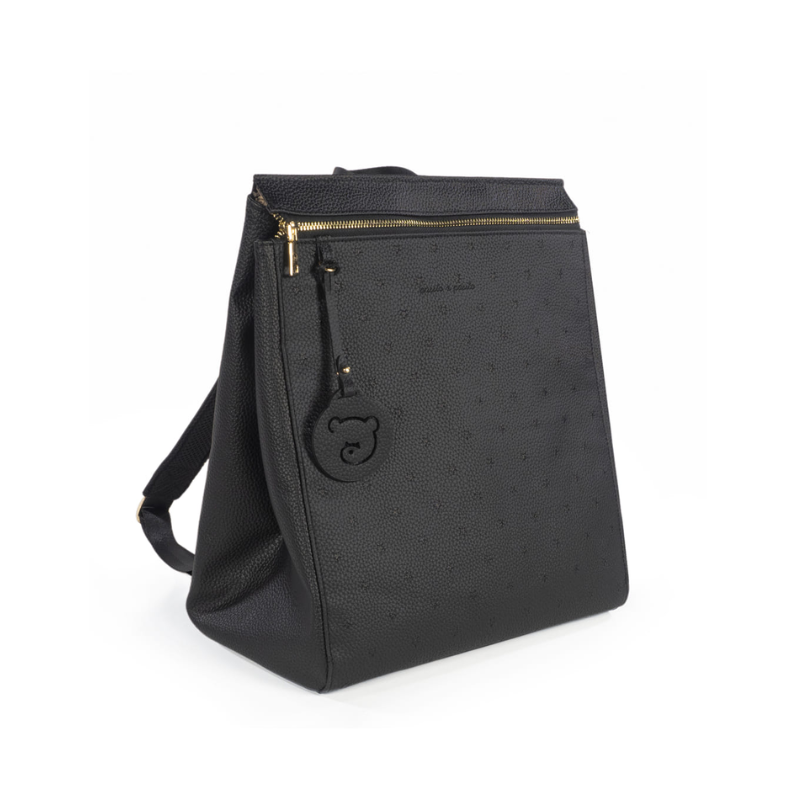Mochila em couro sintético com estrelas gravadas. Grande capacidade para transportar tudo o que você e seu bebé precisam. Bolsos interiores e exteriores para manter tudo à mão e em ordem. Compartimento para PC ou tablet. Bolso térmico interior para garrafas. Inclui trocador. Possui 2 alças grandes ajustáveis para que possa usá-la nas costas e outras duas alças pequenas para usá-la pendurado no carrinho. Inclui uma alça para transportá-lo com o trolley.