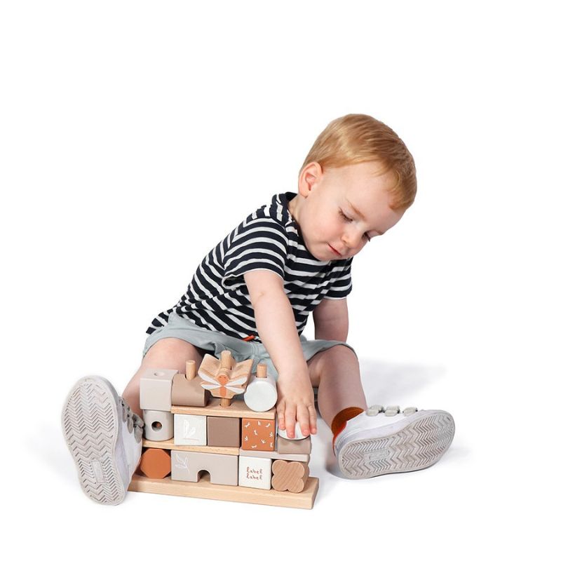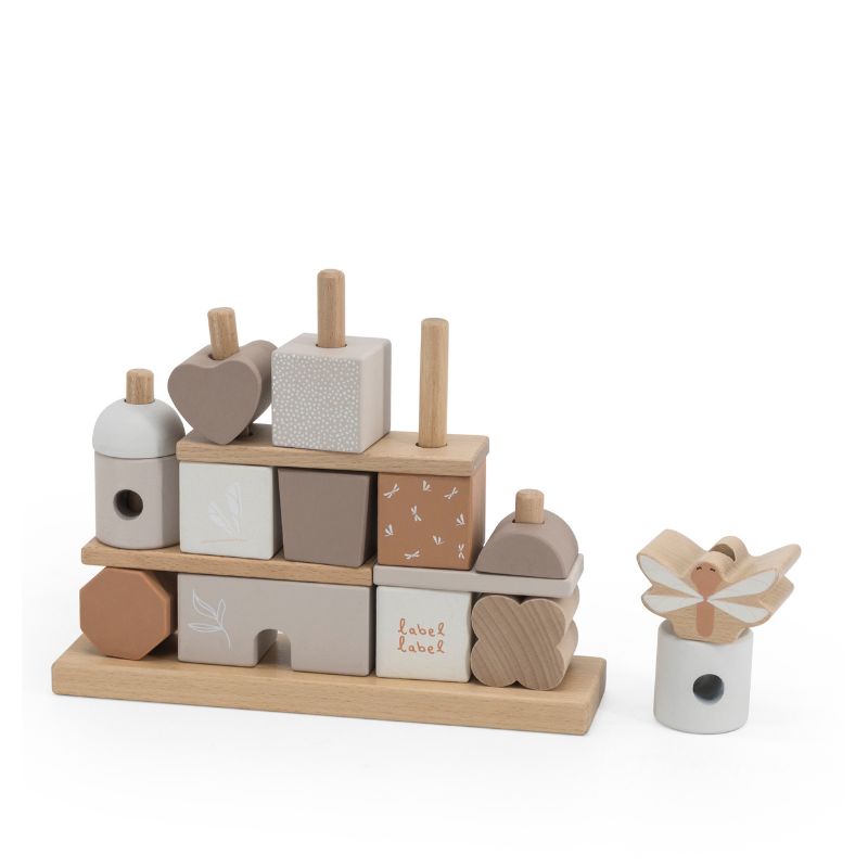 Estes blocos de empilhamento Label Label são feitos de madeira de faia de alta qualidade certificada pelo FSC e foram decorados usando tinta à base de água para crianças. Esta mini casa é composta por 4 filas de blocos de madeira no estilo Label Label. No total, há a base, 8 palitos de madeira, 3 placas de base e 14 blocos em diferentes formas e com diferentes tons de cores, símbolos e padrões com os quais seu filho pode construir sua própria casa de fantasia. Seu filho praticará suas habilidades motoras finas de uma forma lúdica, mas também a fantasia, a engenhosidade e a percepção espacial serão estimuladas.