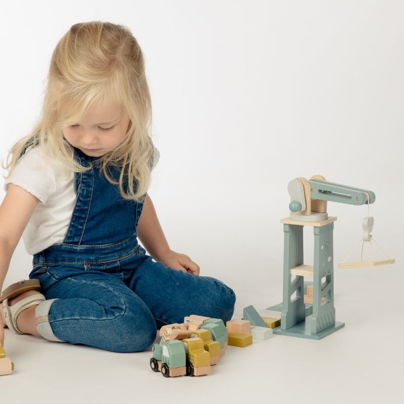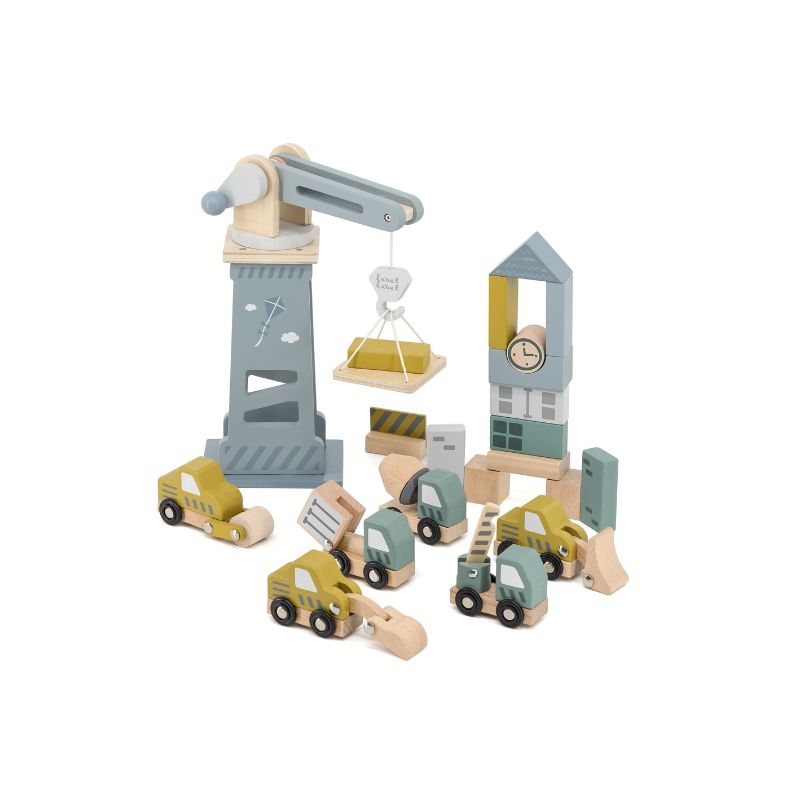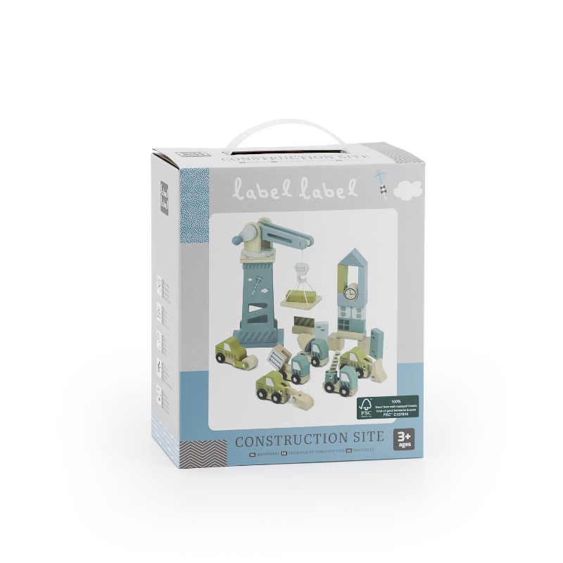 O espaço de brincadeira do seu pequeno transforma-se num verdadeiro canteiro de obras com este fabuloso guindaste de madeira e acessórios. Este canteiro de obras da Label Label é feito de madeira de alta qualidade certificada pelo FSC e decorado com lindas cores usando tinta à base de água, amiga das crianças. Todos os trabalhadores da construção civil em ascensão ficarão nas nuvens! Levantar e mover materiais com o guindaste, construir ou demolir casas, fornecer e remover materiais com camiões... Brincar ganhará uma dimensão totalmente nova. Seu pequeno se tornará um gerente de obra e deixará sua imaginação correr solta em novos projetos. Ao brincar com os 6 camiões, o seu filho dominará as diferentes técnicas de construção. Ao girar a manivela da polia, todos os blocos de construção pesados são levantados. O guindaste pode girar 360° para poder colocar tudo no lugar certo. Tudo muito movimentado...Além de brincar e construir, as crianças estimularão sua criatividade, imaginação e coordenação motora. Dica: com o conjunto de blocos de madeira Label Label você cria ainda mais diversão construindo!