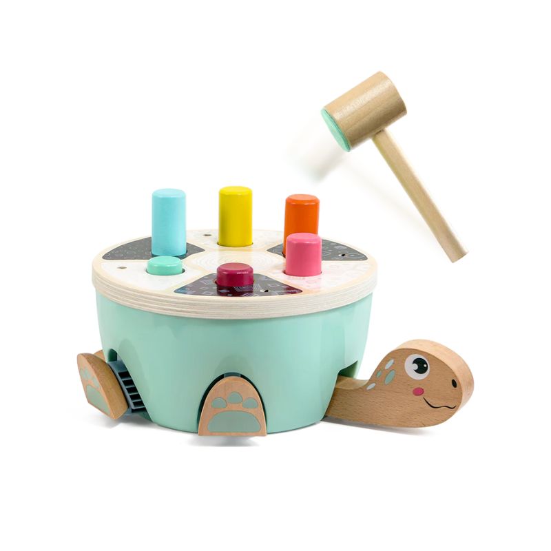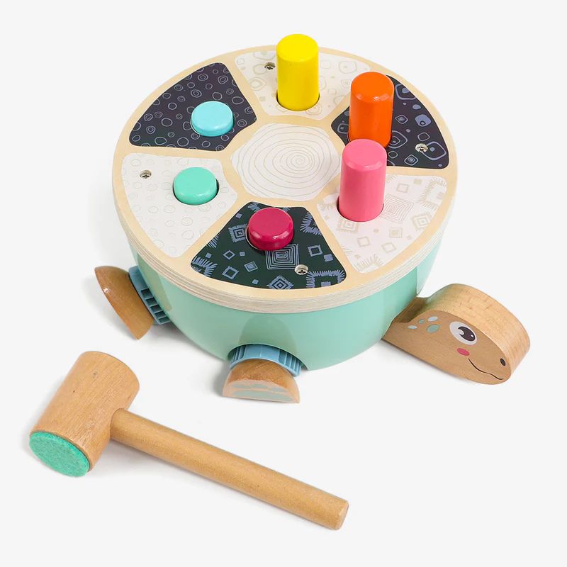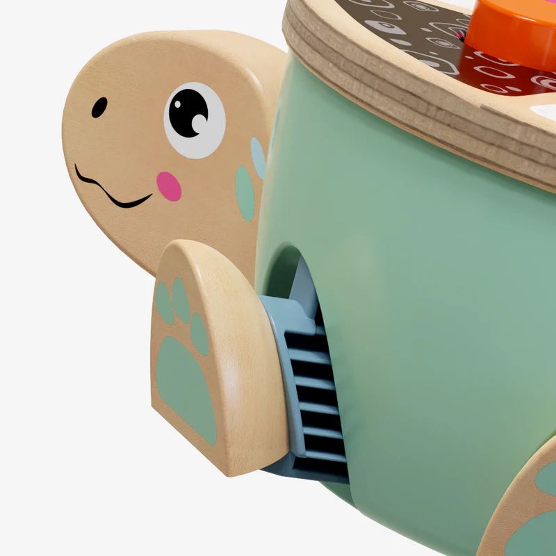 - A cada golpe, a tartaruga ganha vida, com suas patas, cabeça e cauda surgindo, mantendo os pequenos entretidos enquanto aprendem sobre causa e efeito.