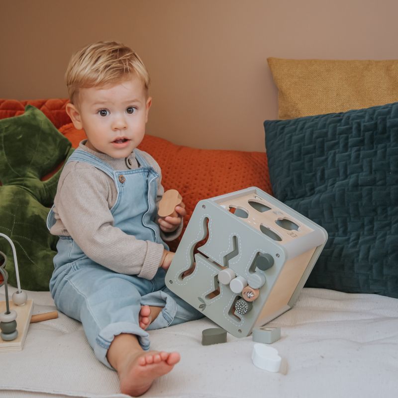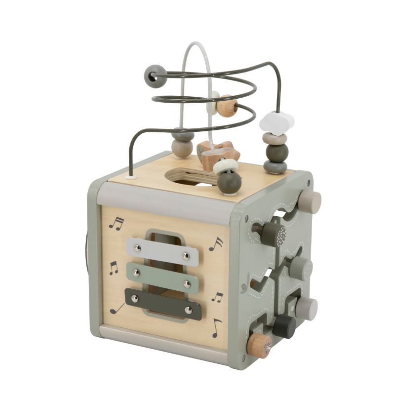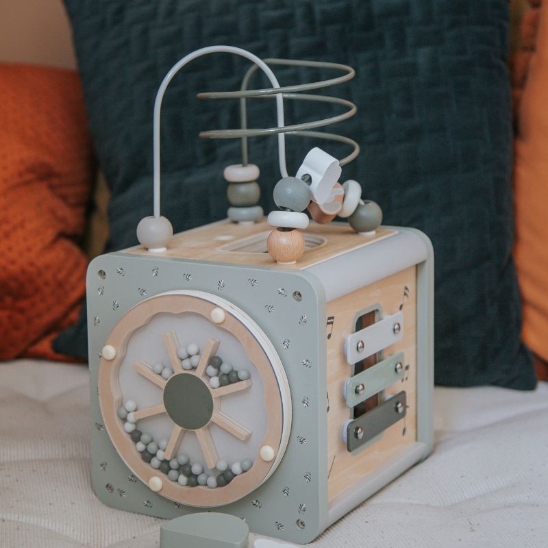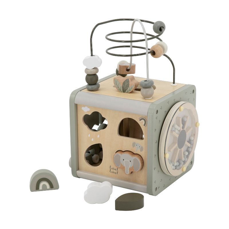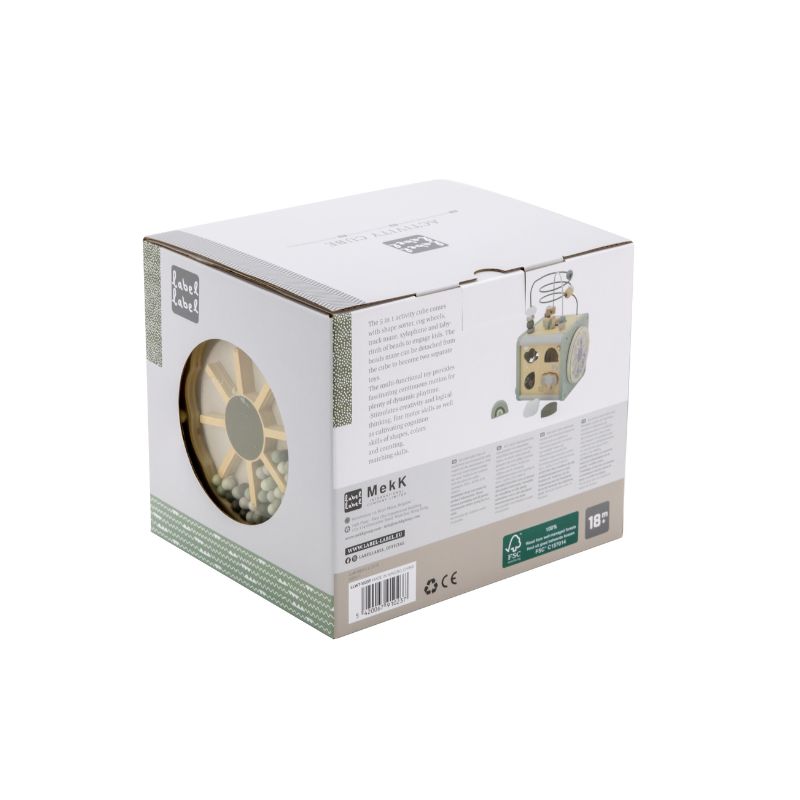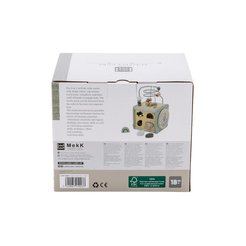O cubo de actividades 5 em 1 da Label Label inclui um encaixe para formas, rodas dentadas, um labirinto, um xilofone e um labirinto de contas que certamente manterá as crianças interessadas. O labirinto de contas pode ser separado do cubo e obtém-se dois brinquedos separados. O cubo multifuncional é um brinquedo fascinante para as crianças, com muitas actividades dinâmicas para brincar. Estimula a criatividade e o raciocínio lógico, as capacidades motoras finas, bem como a cognição e a aprendizagem lúdica: a capacidade de reconhecer diferentes formas e cores, a contagem básica ou as capacidades de correspondência.