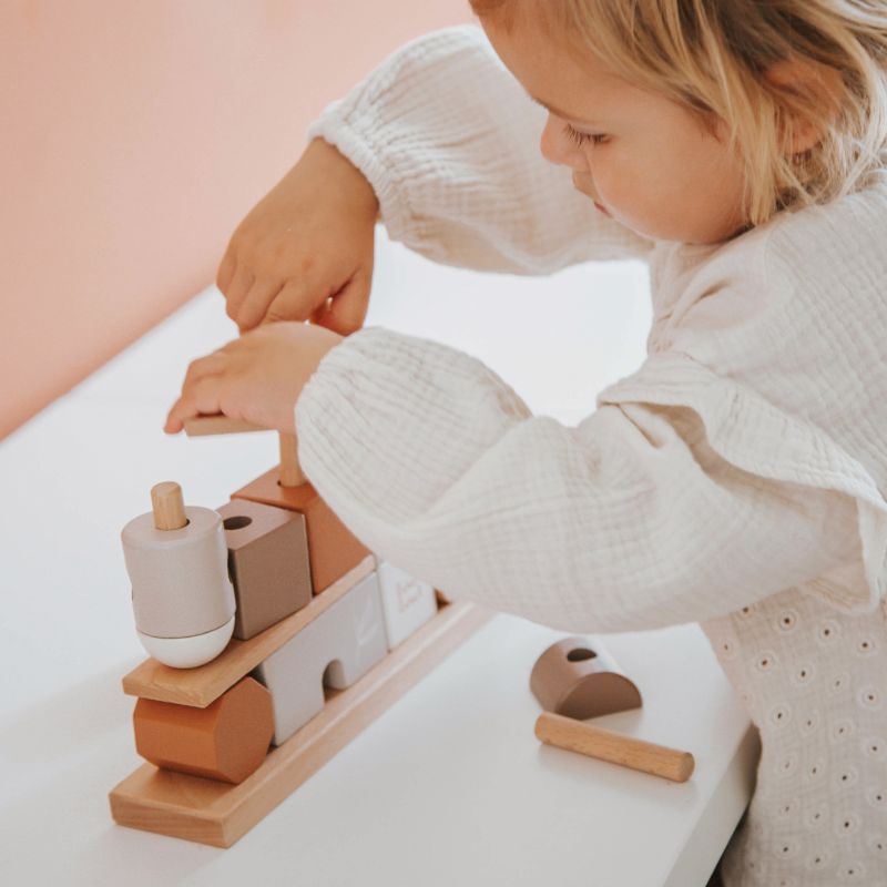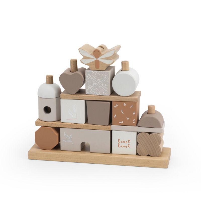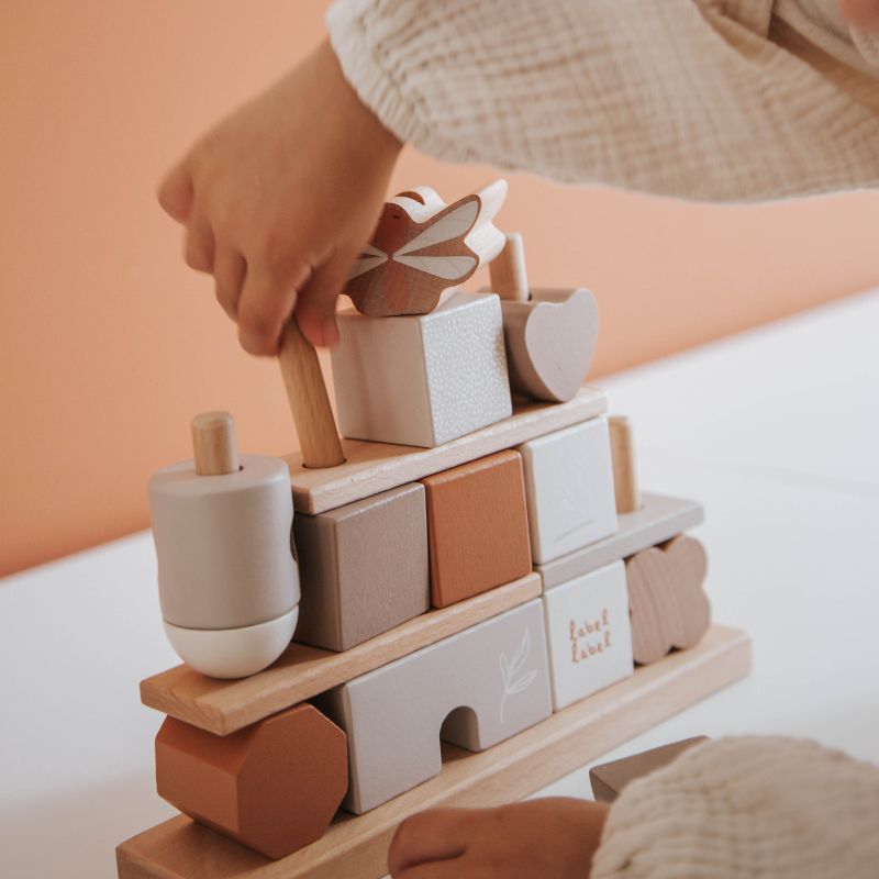 Estes blocos de empilhamento Label Label são feitos de madeira de faia de alta qualidade certificada pelo FSC e foram decorados usando tinta à base de água para crianças. Esta mini casa é composta por 4 filas de blocos de madeira no estilo Label Label. No total, há a base, 8 palitos de madeira, 3 placas de base e 14 blocos em diferentes formas e com diferentes tons de cores, símbolos e padrões com os quais seu filho pode construir sua própria casa de fantasia. Seu filho praticará suas habilidades motoras finas de uma forma lúdica, mas também a fantasia, a engenhosidade e a percepção espacial serão estimuladas.