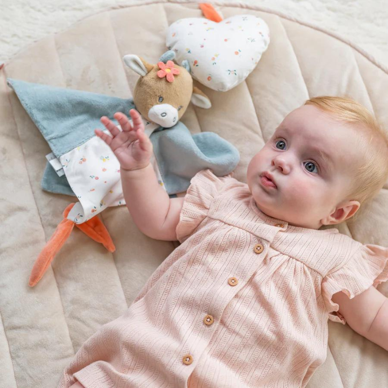 O doudou gato Lana e vaca Mila é o amigo inseparável do seu bebé desde o nascimento. O doudou é ideal para abraçar na cama, mimar em qualquer lugar e brincar no parque. Este doudou oferece inúmeras opções de pega surpreendentes para o seu filho. A cabeça e as etiquetas tentadoras podem ser agarradas confortavelmente pelo seu bebé. Além disso, há também um prático acessório para chupeta. Dica: tenha um doudou extra em casa. Dessa forma, seu filho nunca ficará sem ele quando precisar entrar na máquina de lavar.