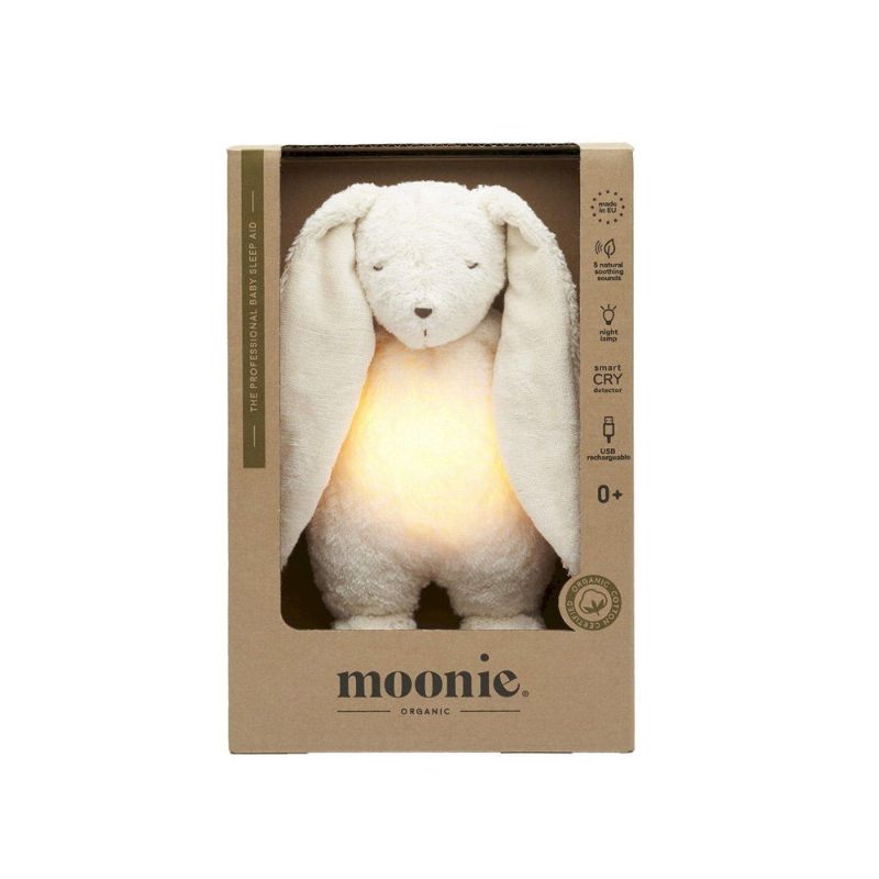 O coelhinho Moonie é um brinquedo macio com sons e luz que acompanhará o seu filho para noites mais tranquilas. Possui 5 sons da natureza, uma canção de embalar e