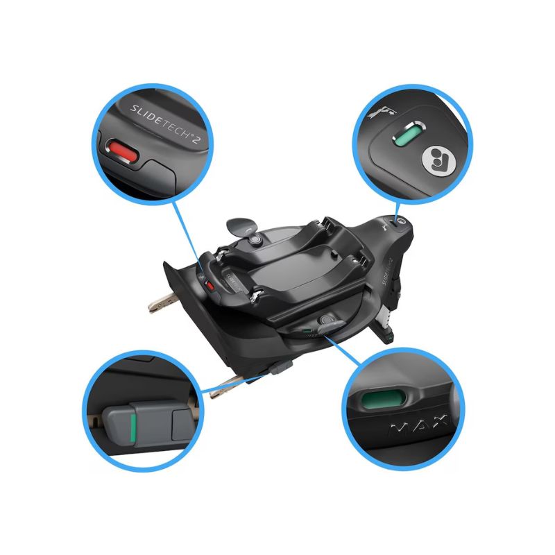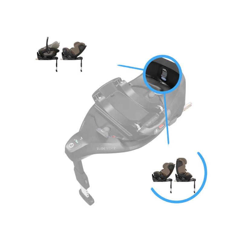 Bloqueio de rotação contra uso indevido involuntárioConfirmação visual da instalação corretaBotão de liberação ergonómico·Tecnologia Slide TechRotação FlexiSpin 360º com uma só mãoInstalação Isofix + perna de apoioEm conformidade com a mais recente e mais segura norma R129/04 da UE, o que significa que é compatível em todos os automóveis compatíveis com i-Size e foi aprovada nos testes de colisão frontal e lateral.Estabilidade e segurança excecionaisRotação suave com uma só mão e SLIDETECH®2, que permite que a cadeira deslize para fora até 27 cm num ângulo amplo e se adapte a qualquer automóvel, independentemente do formato do arco da roda