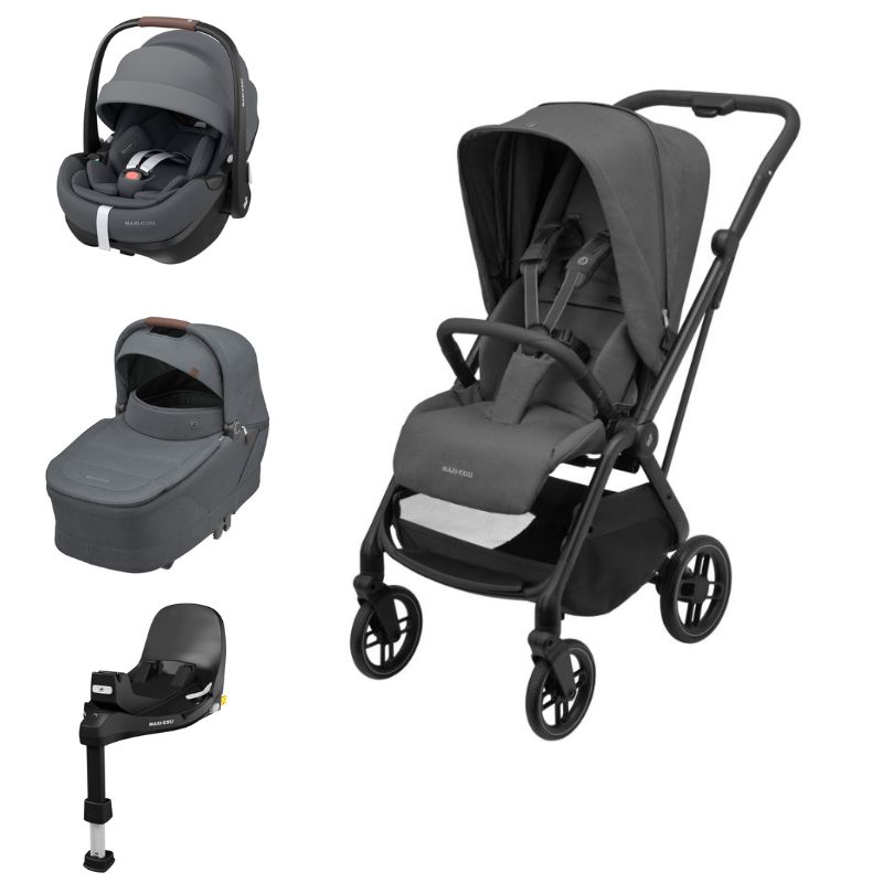 Conjunto composto pelo carrinho Leona², cadeira auto i-Size Pebble 360 Pro², base FamilyFix 360 Pro e alcofa Sense da Maxi Cosi.