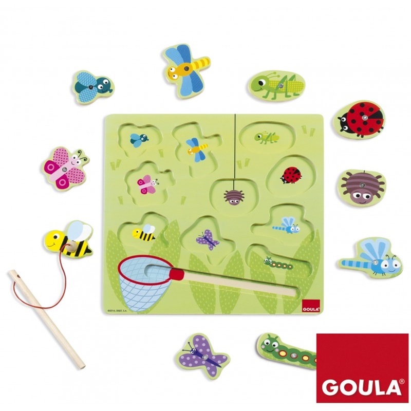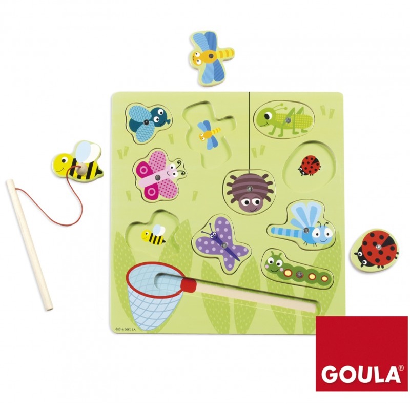 Puzzle educativo de madeira. Com a rede magnética, as crianças têm de apanhar os insetos e voltar a colocá-los no devido lugar. Além de desenvolver a destreza manual e coordenação, ajuda a fazer correspondências, desenvolvendo a atenção e precisão.