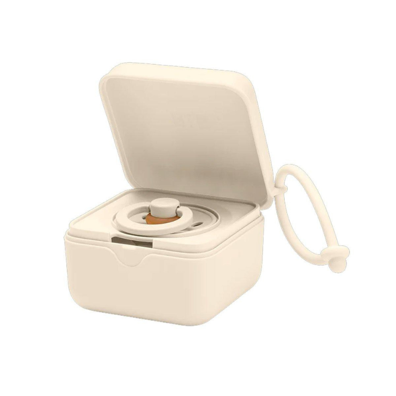 É um produto multi-funcional que não só pode ser usado para armazenar chupetas, mas também como porta lanche e como esterilizador de chupetas. A caixa pode acomodar até 3 chupetas e vem com um acessório removível que serve para colocar a chupeta e um porta chupeta.