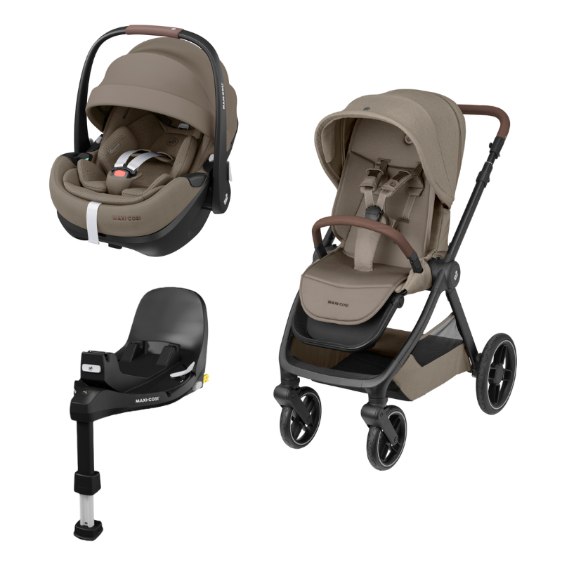 Conjunto composto pelo carrinho Oxford, cadeira auto grupo0+ Pebble 360º Pro² e base Familyfix 360º Pro da Maxi Cosi.