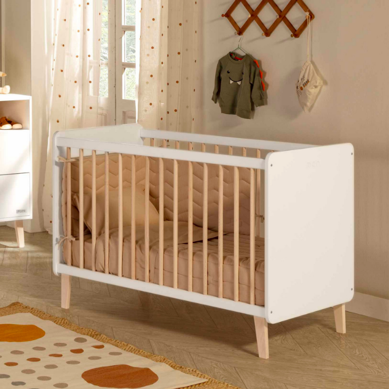 A coleção Trevi oferece um design minimalista, fresco e moderno. O seu acabamento em cera natural realça o tom leve e natural da madeira de faia. O berço é feito de faia e MDF lacado a branco e cera natural. O seu estrado tem três posições com pés fixos. Este berço pode ser complementado com o trocador de berço opcional.