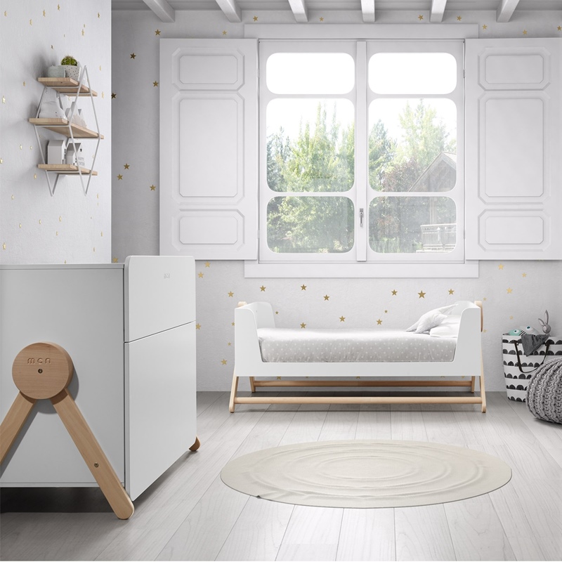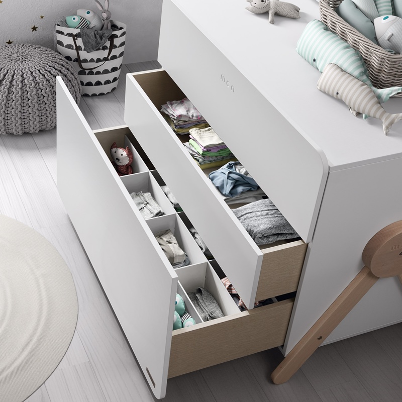 A cómoda da coleção Swing, é caracterizada pelo seu design moderno e minimalista, que combina o branco ou cinza escuro com as lâminas de madeira de Faia de cor escandinava. Aparentemente, tem apenas duas gavetas. Mas, quando abre a de baixo, aparece uma terceira gaveta que incorpora um sistema push para permitir uma abertura e fecho mais suave e silencioso.
