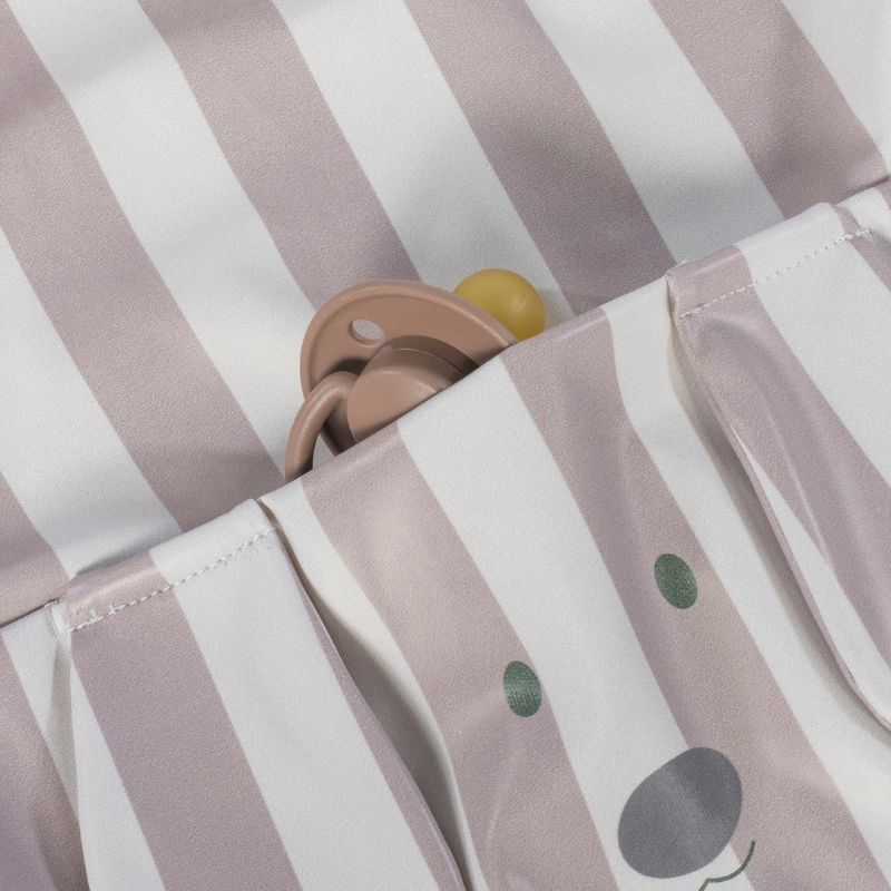 A babete impermeável Sintra da Walking Mum é o acessório ideal para manter as roupas do seu bebé limpas e secas durante as refeições. Indicado para crianças de 6 meses a 3 anos, esta babete é feita de PU impermeável, tornando-a fácil de limpar e resistente a manchas e líquidos. È ideal para o uso diário, oferecendo liberdade de movimentos enquanto mantém seu pequeno limpo e seco. Seu design charmoso com orelhas em relevo e padrão listrado lhe dá um toque fofo e divertido. Também tem um bolso para migalhas para juntar restos de comida, evitando que suje as roupas e a mesa.