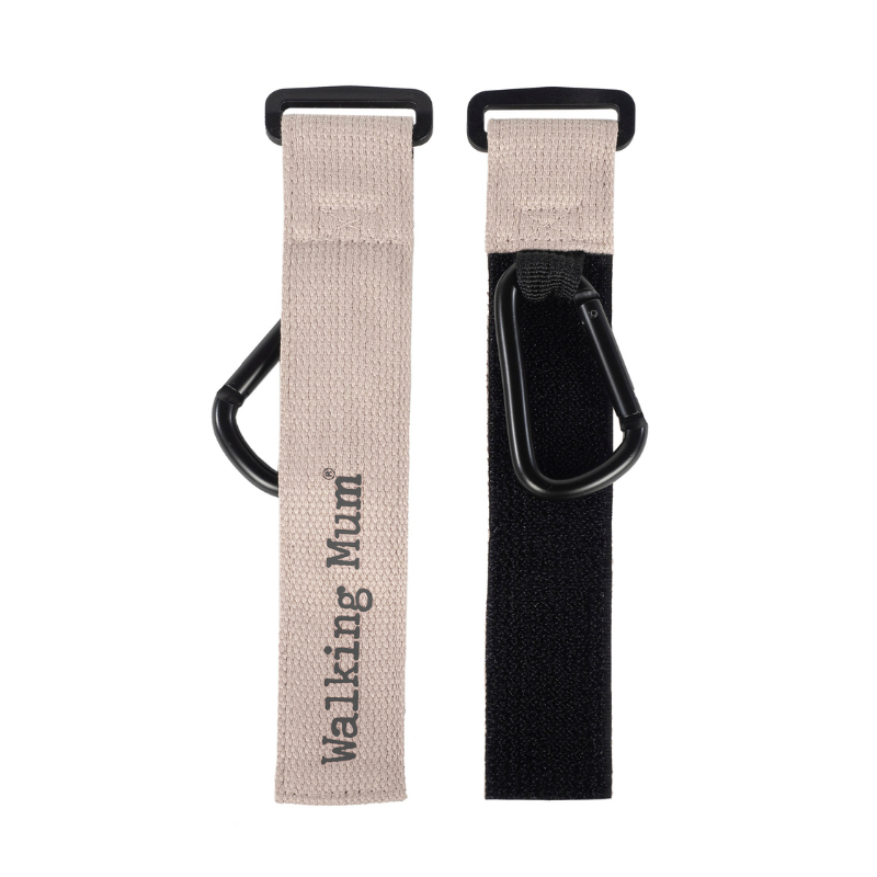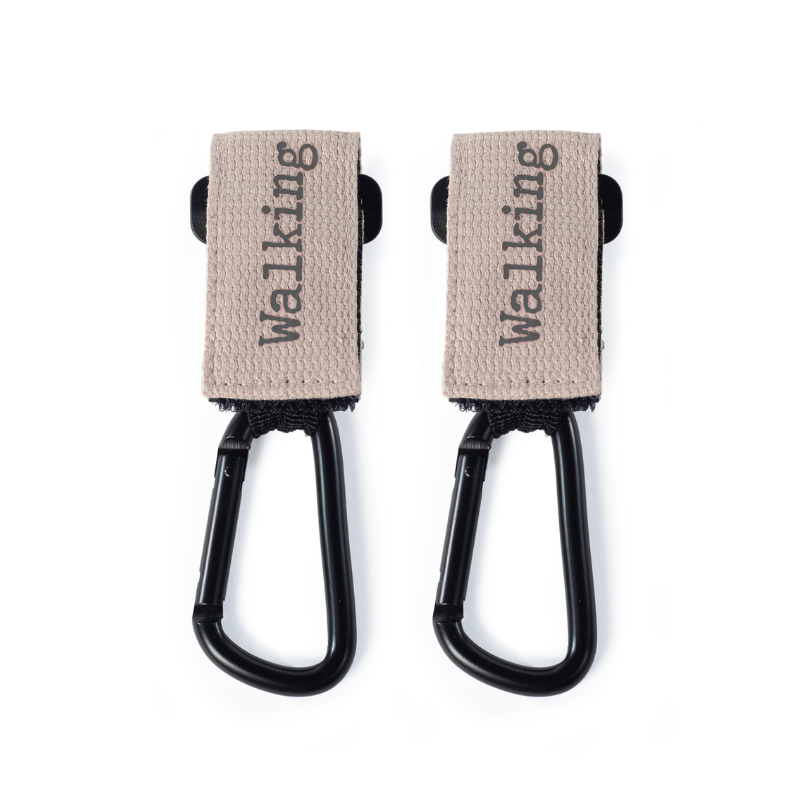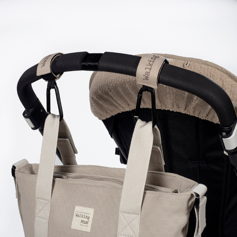 Conjunto de 2 ganchos para carrinhos Eco Mum. Gancho metálico. Muito fácil de colocar graças às suas tiras de velcro. Perfeito para pendurar o cesto ou qualquer bolsa que você precise carregar no carrinho.