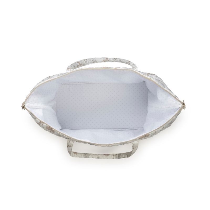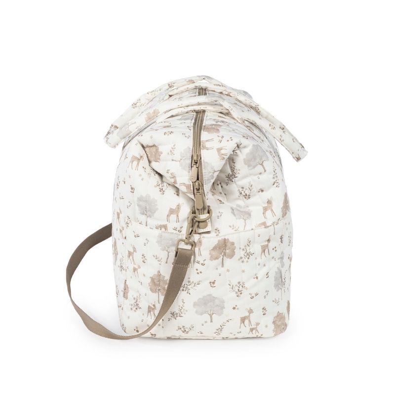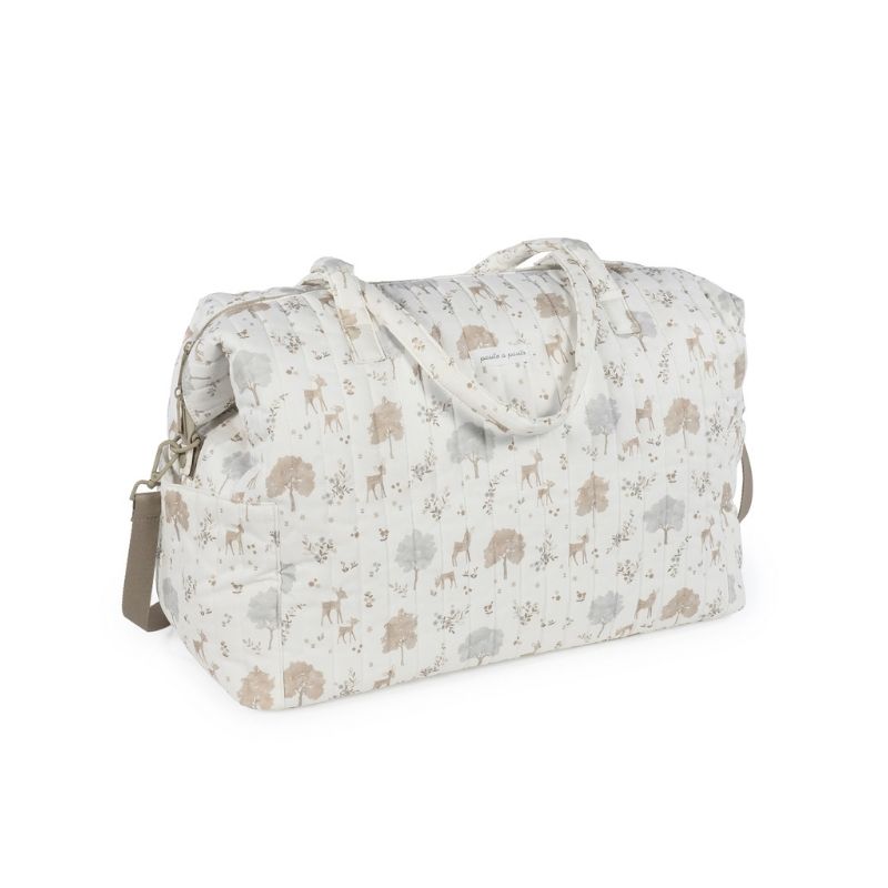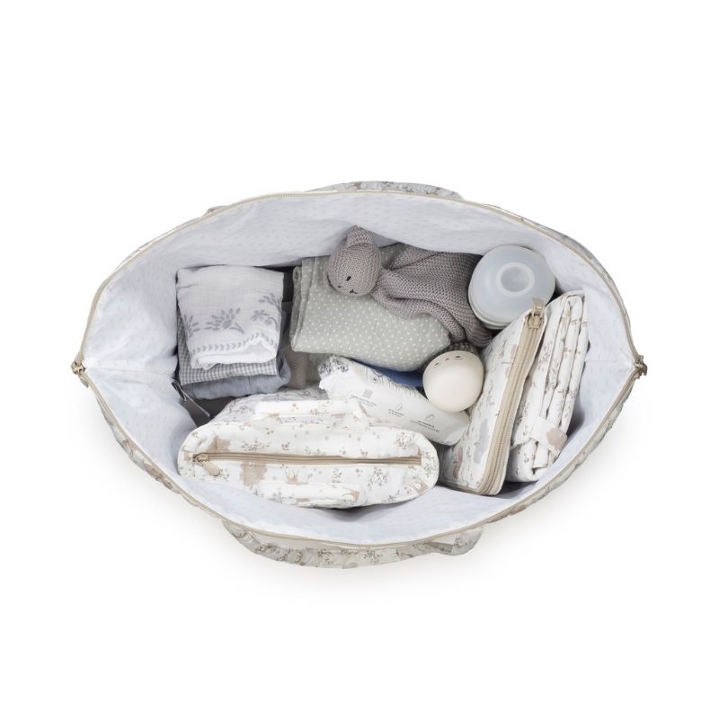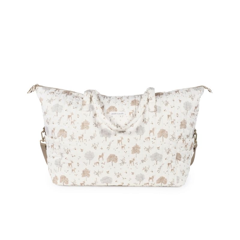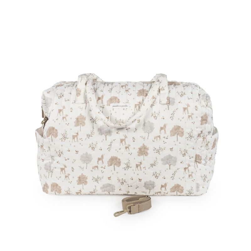 Descubra a combinação perfeita de estilo e praticidade com a bolsa XL Nara, 100% algodão com um delicado estampado de veados e árvores em tons neutros. O seu tratamento à prova de água torna-a resistente à água, garantindo proteção e durabilidade no uso diário. Destaca-se pelo design moderno e espaçoso, ideal para pais que procuram um acessório versátil para o dia a dia. Bolsa de grande capacidade com vários bolsos para manter tudo organizado quando estiver a passear ou viajar com o seu bebé. Inclui vários bolsos internos para melhor organização. Alça superior dupla para transporte confortável na mão e uma alça ajustável e removível para uso no ombro ou na transversal.