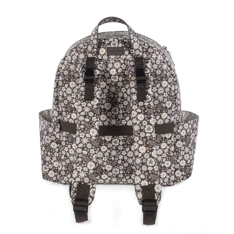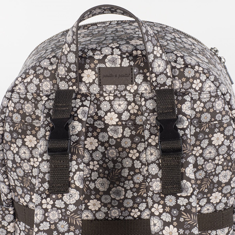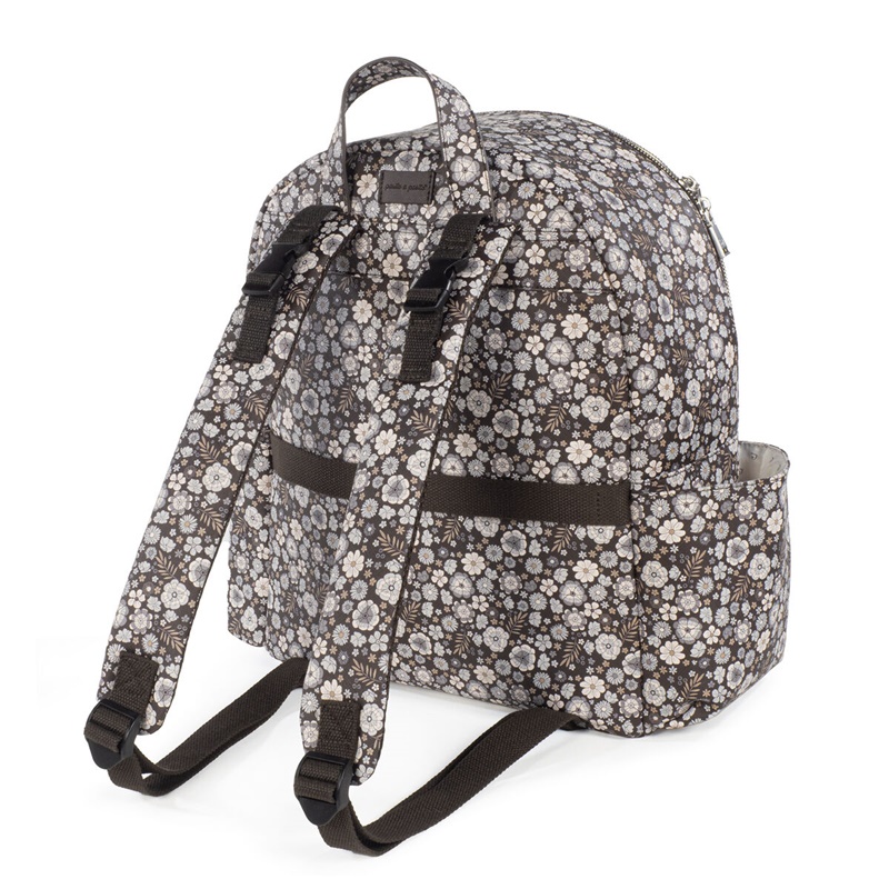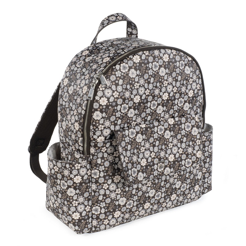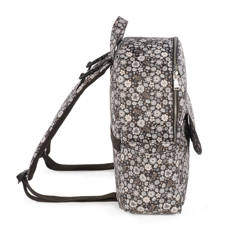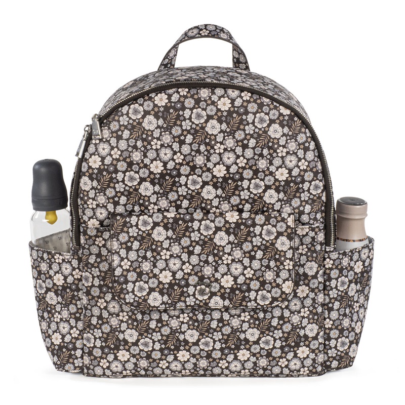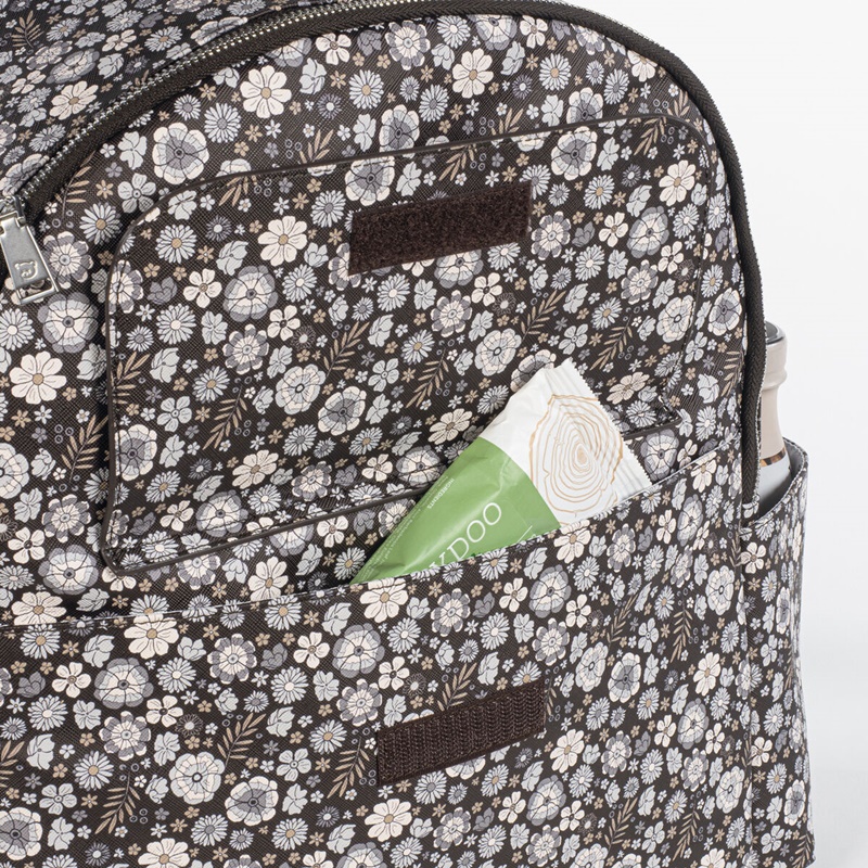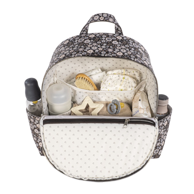 Mochila em couro sintético estampada com flores com grande capacidade para transportar tudo o que o seu bebé precisa. Bolsos interiores e exteriores para manter tudo à mão e em ordem. Possui bolso térmico interno para garrafas e um bolso laminado para roupas molhadas. Com compartimento para PC ou tablet. Inclui 2 alças para transportar no carrinho.