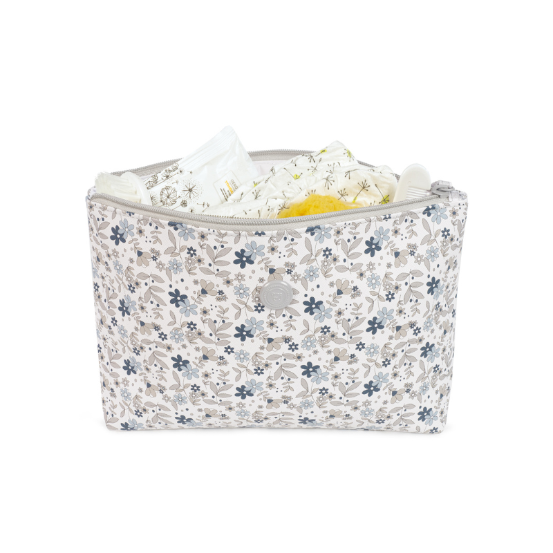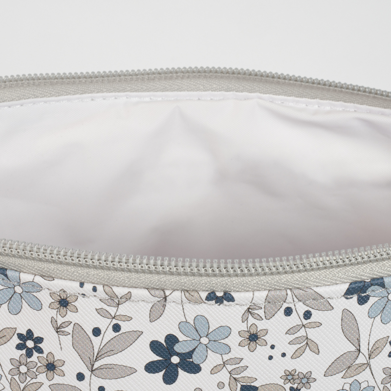 O necessaire Delia é uma pequena bolsa especialmente desenhada para transportar todos os artigos de higiene necessários para o seu bebé quando sai de casa. É um modelo único e com muito estilo para atender o que precisa. Feito de imitação de pele resistente e macia estampada com flores e com uma forma para caber facilmente na bolsa. Tem um design bonito, simples e confortável que oferece um espaço pequeno, mas preciso, para transportar apenas o que precisa para a higiene do seu bebé, como o pente, loções e outros objetos que, por serem tão pequenos, às vezes se perdem dentro do saco de passeio.