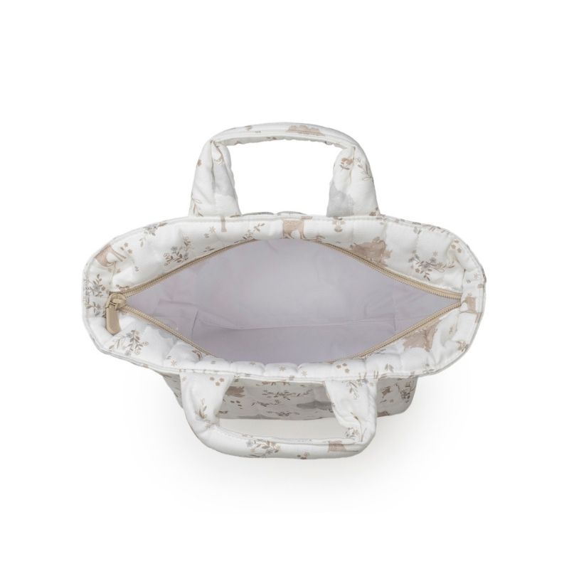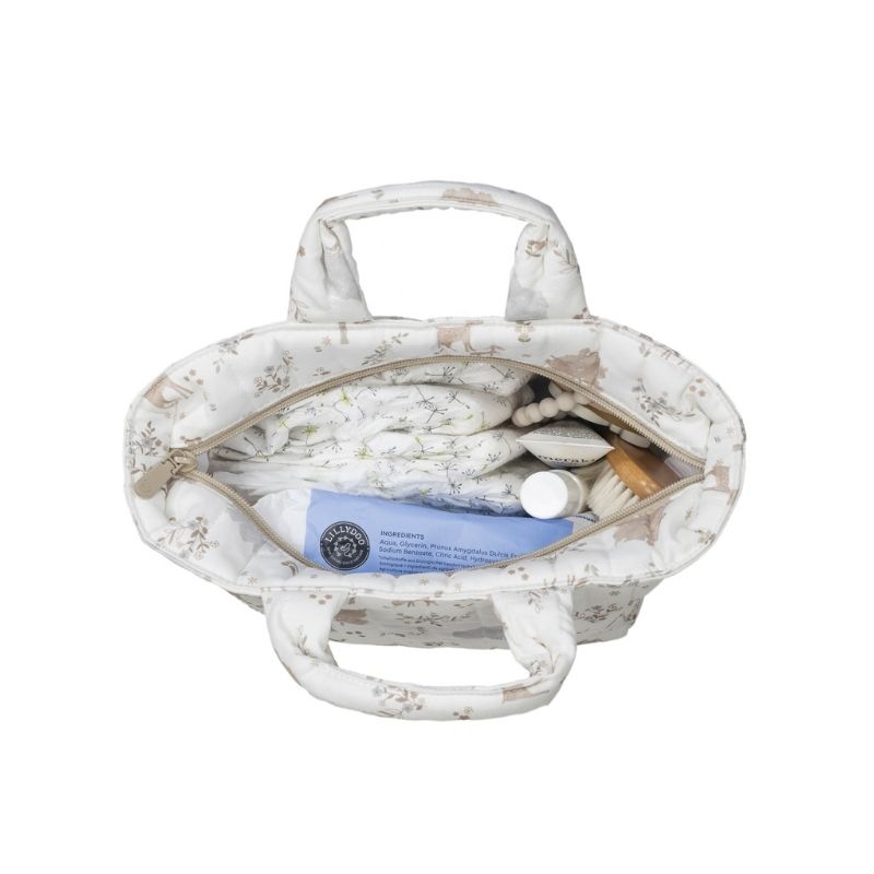 O necessaire Nara tem um design bonito e simples que oferece um espaço pequeno, mas preciso, para levar exatamente o que precisa para a higiene do seu bebé: fraldas, toalhitas, pente, loções e outros itens que, por serem tão pequenos, às vezes se perdem dentro da bolsa de maternidade. Possui um fecho.