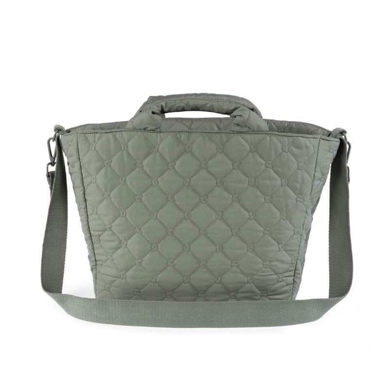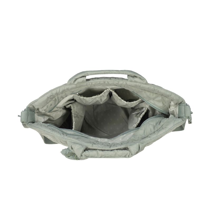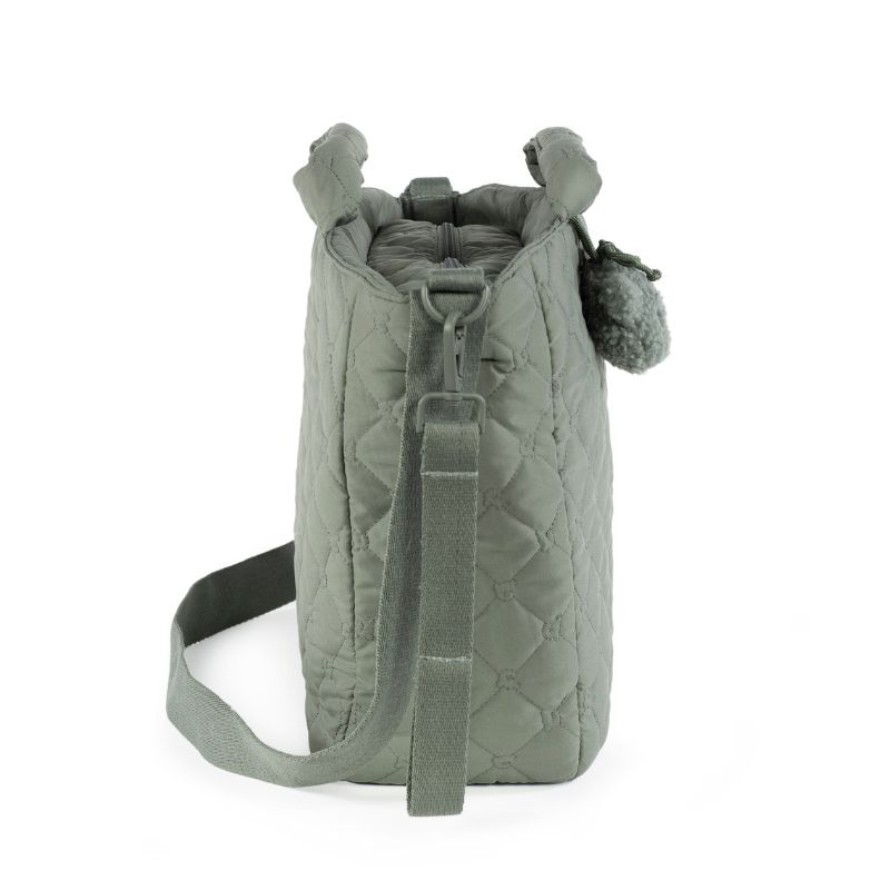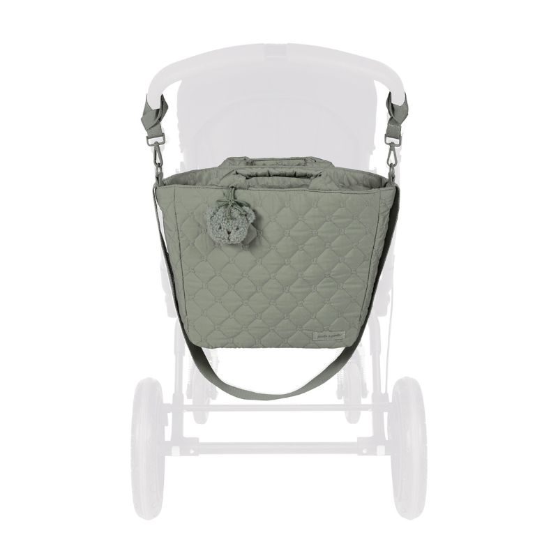 Duas alças curtas, ajustáveis para colocação no carrinho de passeio Vários bolsos exteriores e interiores Bolso plastificado para roupa suja