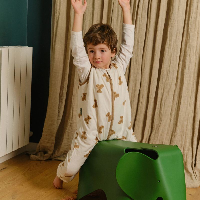 Nosso saco de dormir de meia temporada é uma peça de roupa quente levemente acolchoada, projetada para ser usada sobre o pijama para manter o seu filho aquecido enquanto dorme, brinca, caminha ou gatinha.