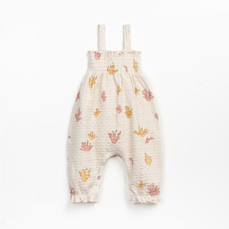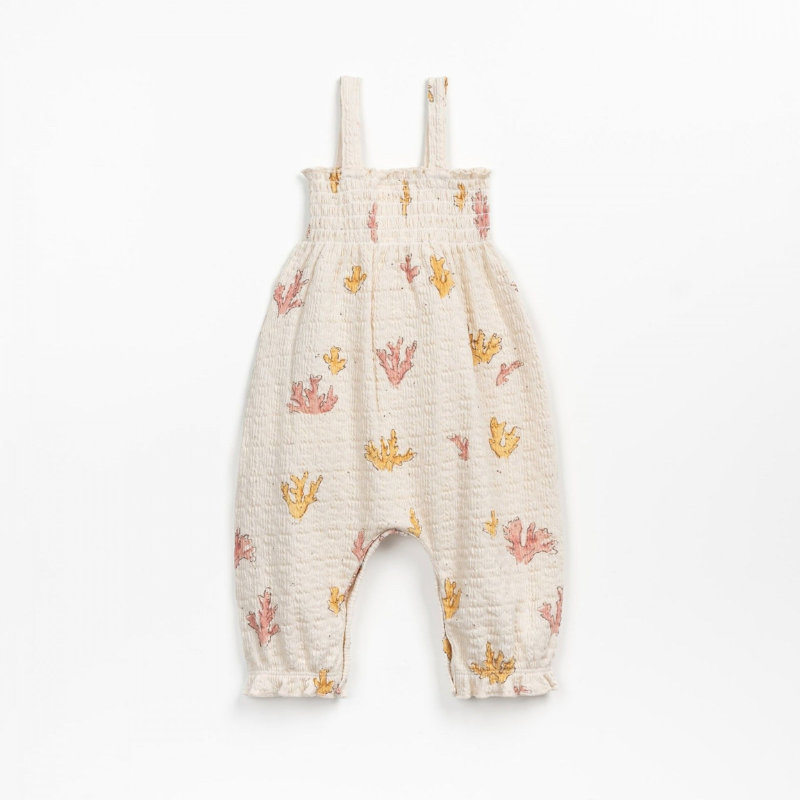 Macacão em malha com mistura de algodão orgânico e poliéster reciclado. Com alças e decote reto, tem peito elástico e abertura entre pernas com molas de metal sem níquel (abertura entre pernas até ao tamanho 18M).