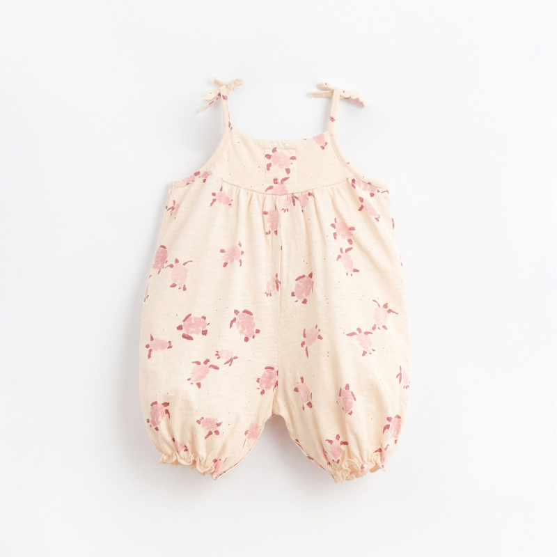 Este macacão é feito em malha de algodão orgânico, na cor Reed. É um modelo comprido com alças, tem abertura frontal com botões de madeira, punhos com elástico e folho, abertura entre pernas com molas de metal sem níquel (abertura entre pernas até ao tamanho 12M) e o nosso estampado de tartarugas. Todas as matérias primas utilizadas nesta peça têm certificação Standard 100 by OEKO-TEX, o que a torna livre de substâncias nocivas para a pele das crianças.