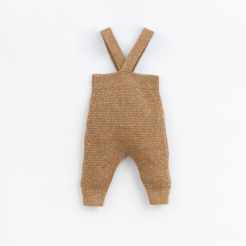 Este macacão é feito em malha tricot com mistura de algodão e fibras recicladas, na cor Braid. É um modelo com cinto elástico, as alças são cruzadas e prendem atrás com botão de coco.
