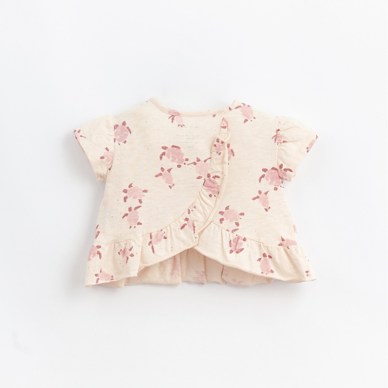 Esta t-shirt é feita em malha de algodão orgânico, na cor Reed. É um modelo com decote redondo e manga curta, tem abertura no ombro com botões de madeira, trespasse nas costas, encaixe de folho no fundo e o nosso estampado de tartarugas. Todas as matérias primas utilizadas nesta peça têm certificação Standard 100 by OEKO-TEX, o que a torna livre de substâncias nocivas para a pele das crianças.