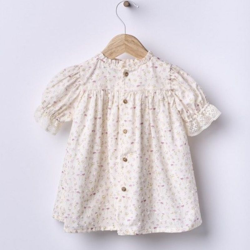 Vestido de manga curta ideal para bebés meninas, até aos 4 anos. O vestido BREEZE é produzido tecido de algodão suave com um charmoso estampado de flores e detalhes em renda, forrado em algodão leve para maior conforto.