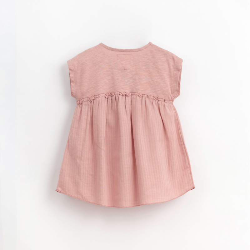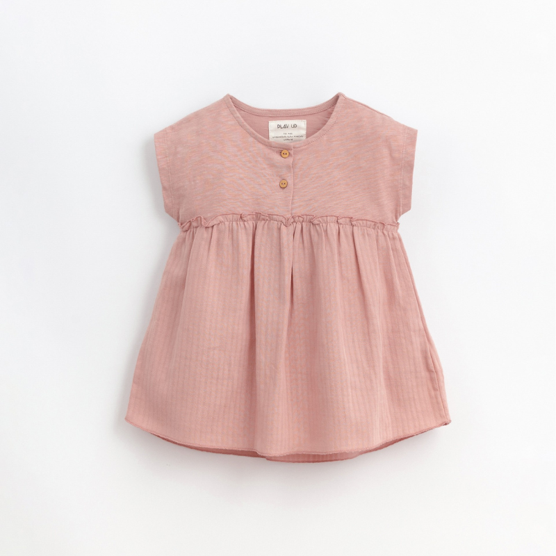Este vestido é feito com mistura de malha em algodão orgânico e tecido em algodão, na cor Tavares. É um modelo com decote redondo, tem abertura frontal com botões de madeira, ombros caídos e pormenor de folho na cintura. Todas as matérias primas utilizadas nesta peça têm certificação Standard 100 by OEKO-TEX, o que a torna livre de substâncias nocivas para a pele das crianças.