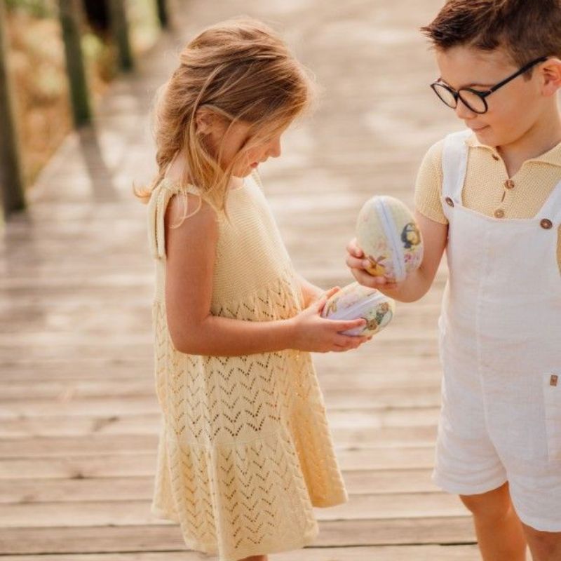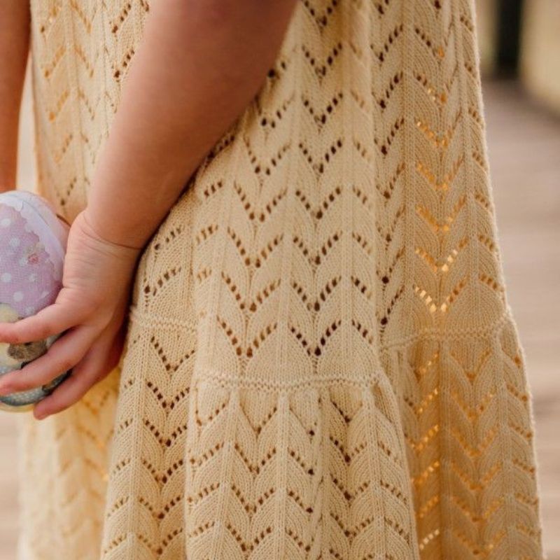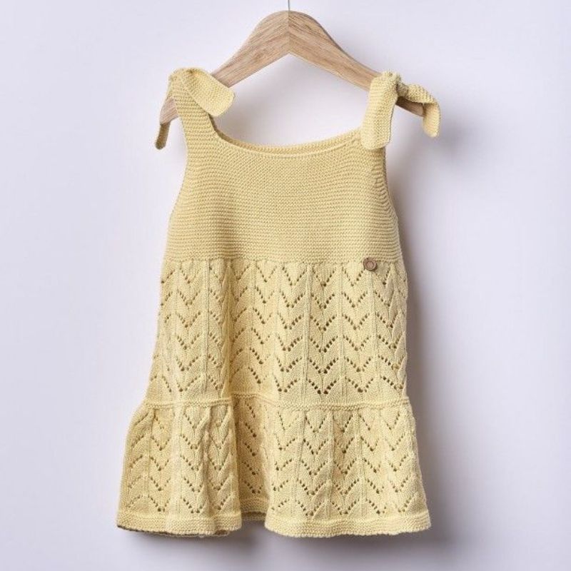 Vestido de alças tricotado em malha de algodão orgânico suave, ideal para bebés meninas, até aos 4 anos. O vestido tricotado SUMMER IN THE VILLAGE aperta nas alças com laço.