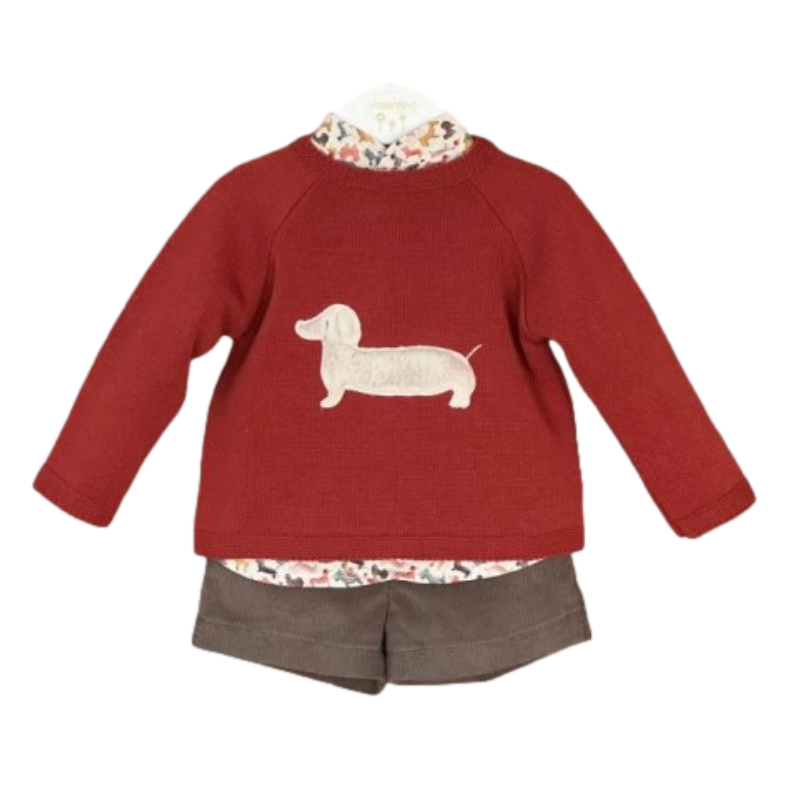 Conjunto para bebé menino da coleção Outono/Inverno  da marca Valentina Bebes. Camisa leve de algodão de manga comprida por baixo da camisola de malha fina, combinada com calções de bombazine forrados.