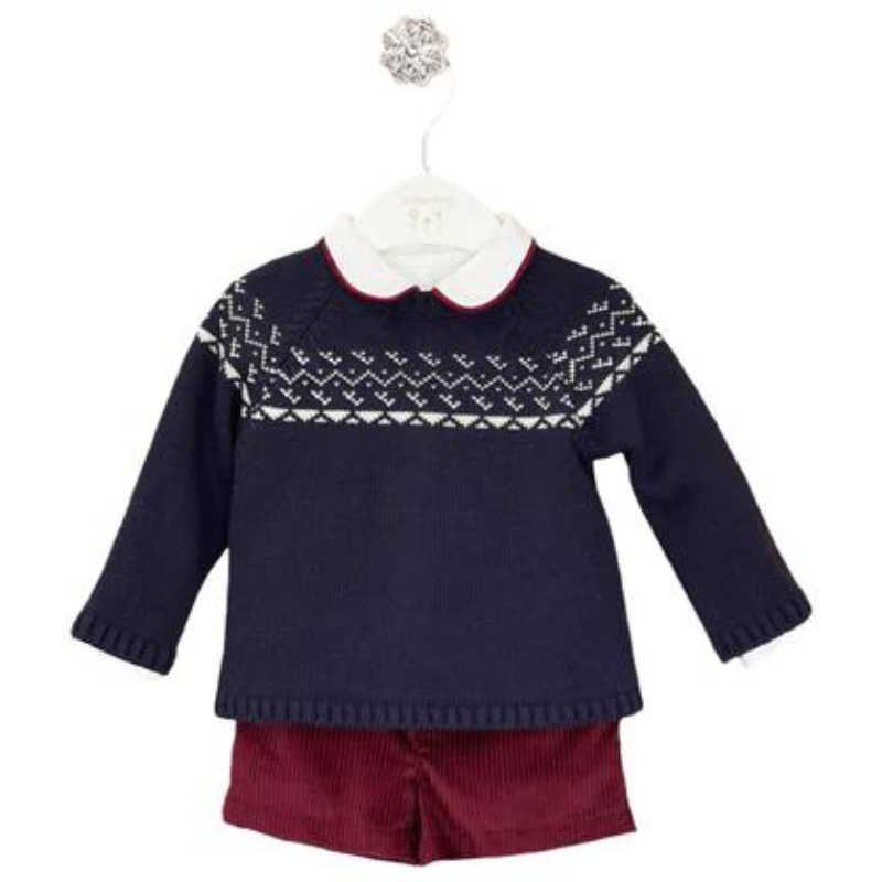 Conjunto de roupa da coleção Outono/Inverno da marca Valentina Bebes . Camisa leve branca de manga comprida com gola de algodão por baixo da camisola de malha fina marinho com padrão branco no peito e ombros, combinado com calçãode bombazine cor de vinho super macio.