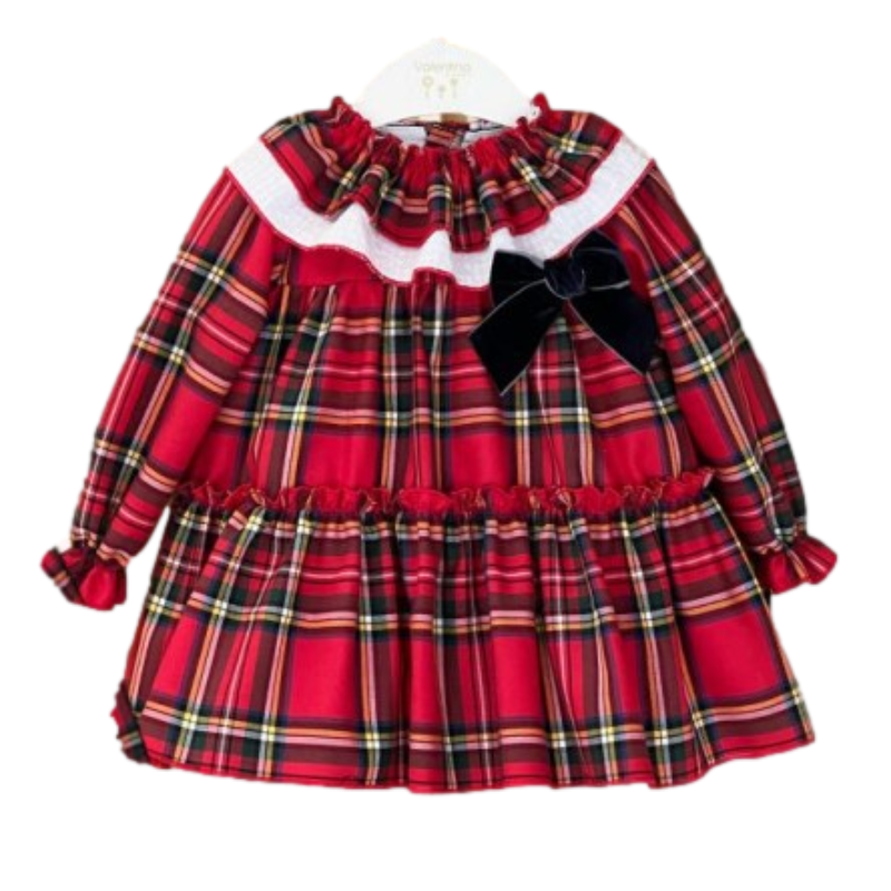 Conjunto de vestido com tapa fraldas da coleção Outono/Inverno da marca Valentina Bebes . Vestido leve xadrez vermelho de manga comprida em tecido de algodão decorado com um laço de veludo extra grande. A roupa é completada com tapa fraldas de xadrez vermelho combinando.