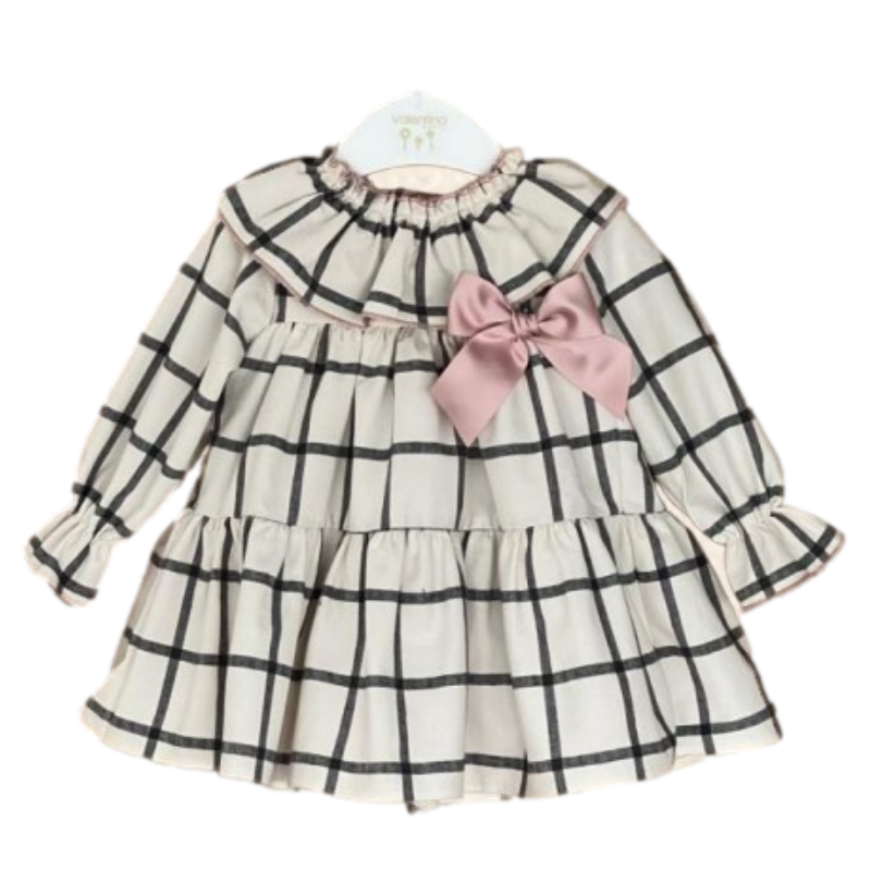 Vestido com tapa fraldas da coleção Outono/Inverno da marca Valentina Bebes. Vestido super macio de algodão cru e cinza carvão xadrez de manga comprida com gola grande com babados, decorado com um laço de gorgorão rosa escuro no peito.