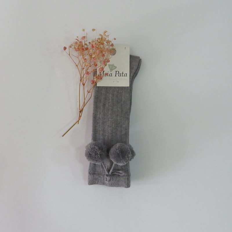 Meia canelada pelo joelho com pompom da Meia Pata. Disponíveis em várias cores para menino ou menina.