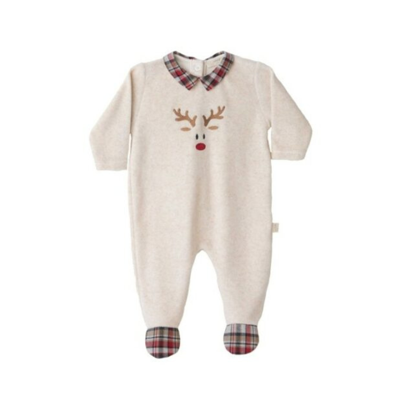 Babygrow em algodão laminado Wood da Baby Gi, com uma amigável rena bordada.