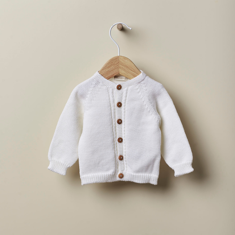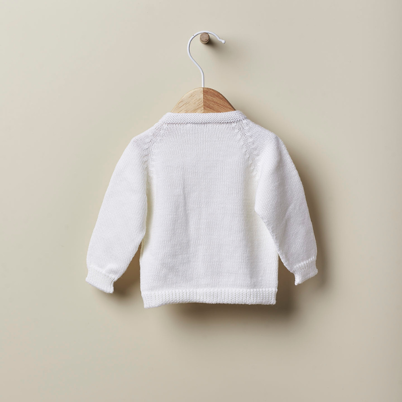 tricotado em lã merino suave, ideal para bebés meninos e meninas, até aos 12 meses. O casaco de manga comprida CELEBRATION, com decote redondo, aperta na